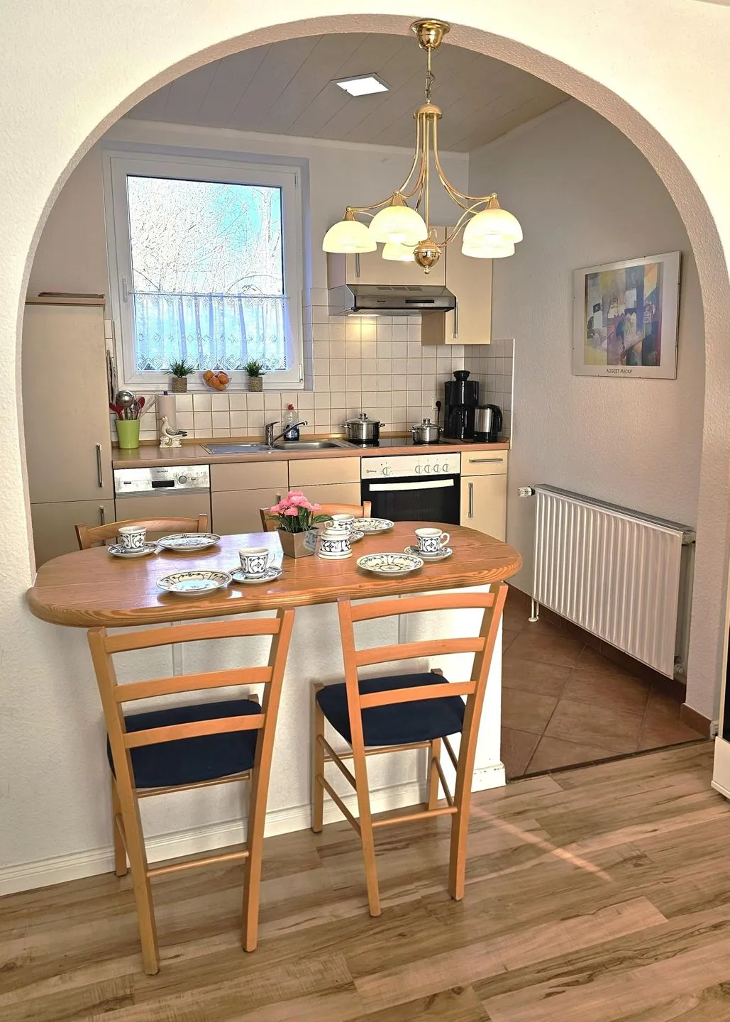 Die offene Küche ist zum Wohnzimmer hin gestaltet und bietet eine umfangreiche Ausstattung für die Selbstversorgung: Herd mit 4-Platten-Kochfeld, Backofen, Mikrowelle, Kühlschrank mit Gefrierfach, Spülmaschine sowie Toaster, Wasserkocher und Kaffeemaschine. Geschirr, Besteck und Küchenutensilien sind vorhanden.