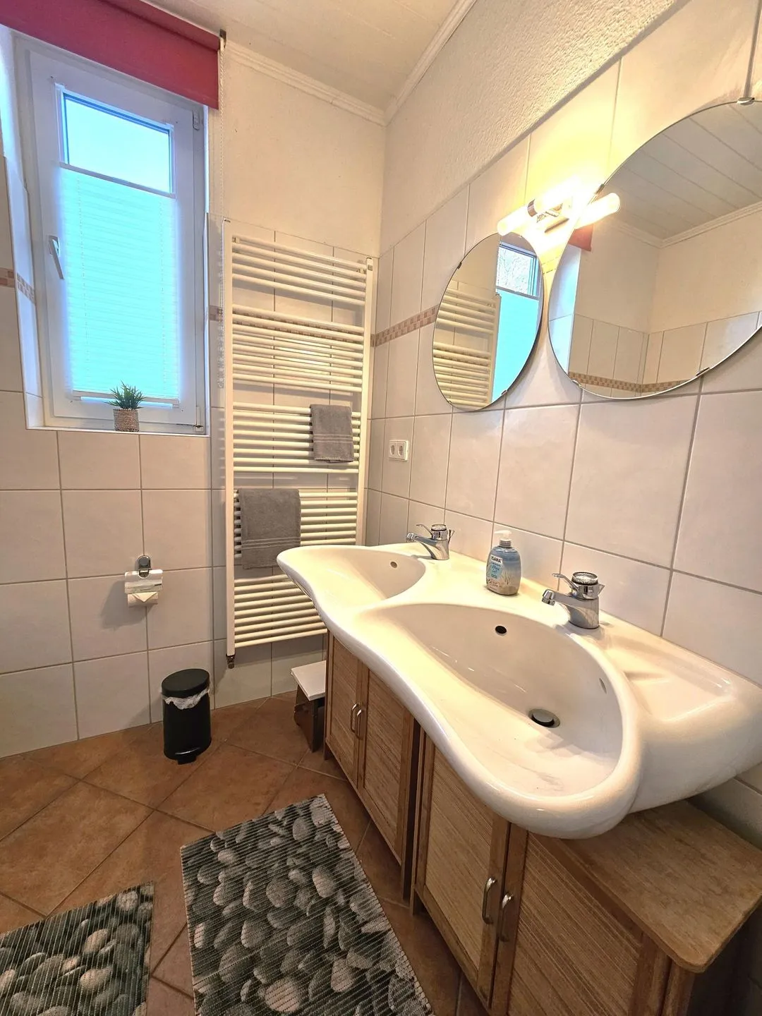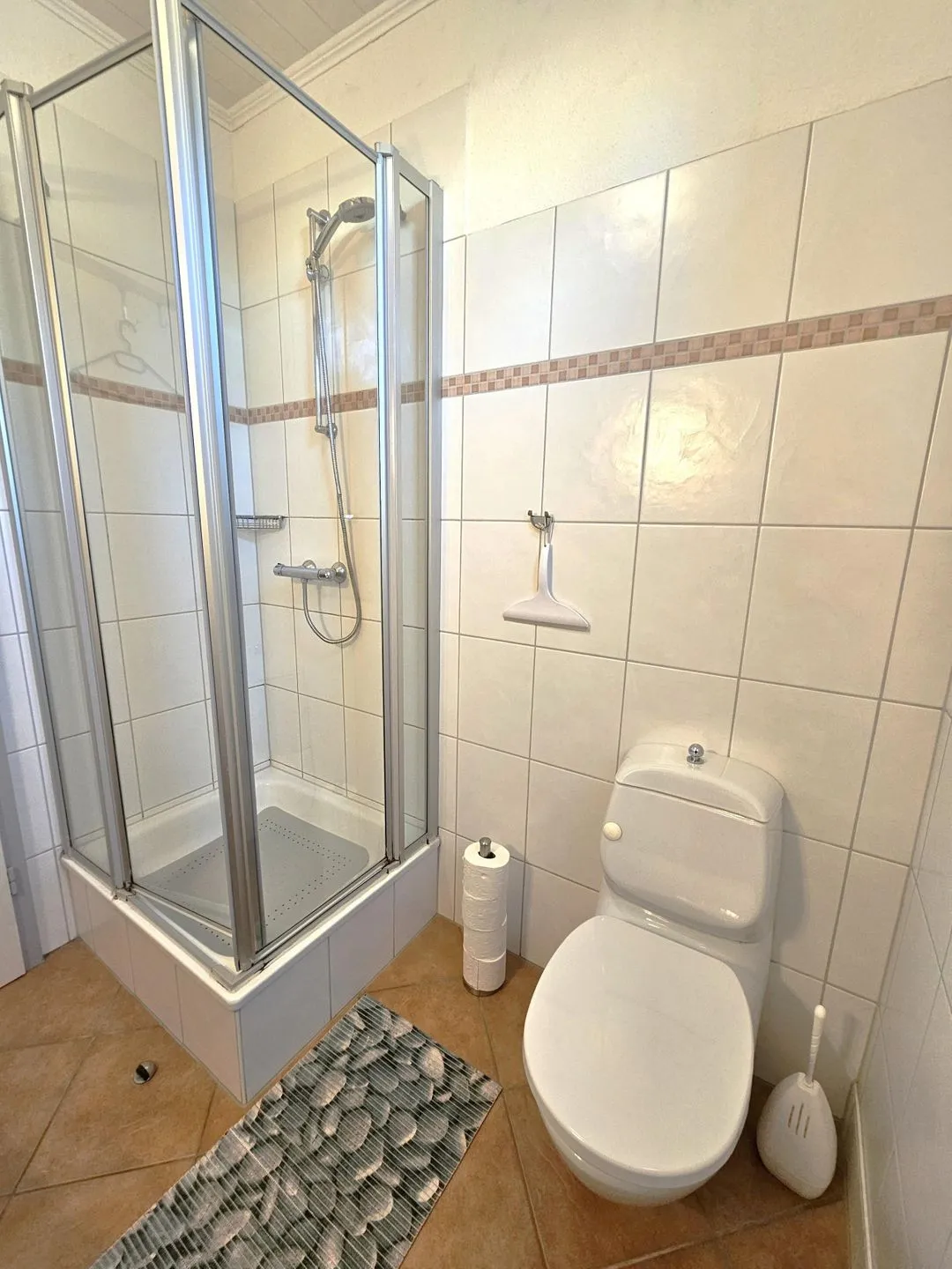 Das Badezimmer verfügt über WC, Waschbecken, Spiegel, Dusche und warmes Wasser.