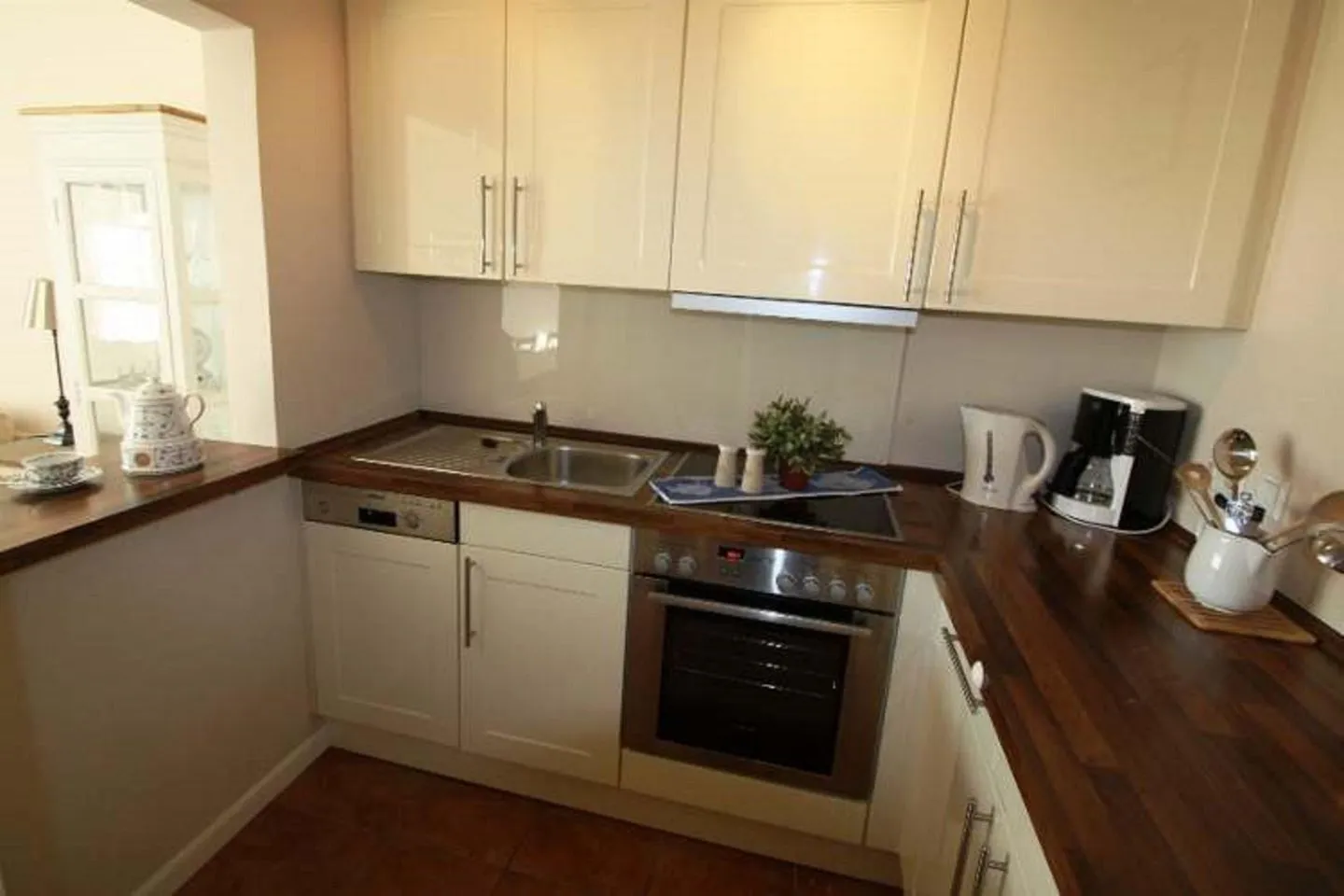 Der Wohnbereich liegt im Parterre und ist mit Fliesen ausgestattet. Hier finden Sie eine gemütliche Sofaecke mit Sessel, einen Essbereich mit Esstisch sowie TV, Radio und Telefon. Die offene Küche ist direkt zum Wohnzimmer hin gestaltet und bietet alles für die Selbstversorgung: 4-Platten-Herd, Backofen, Mikrowelle, Kühlschrank mit Gefrierfach, Spülmaschine sowie Kaffeemaschine, Wasserkocher, Toaster und vollständige Küchenutensilien inklusive Geschirr und Besteck.