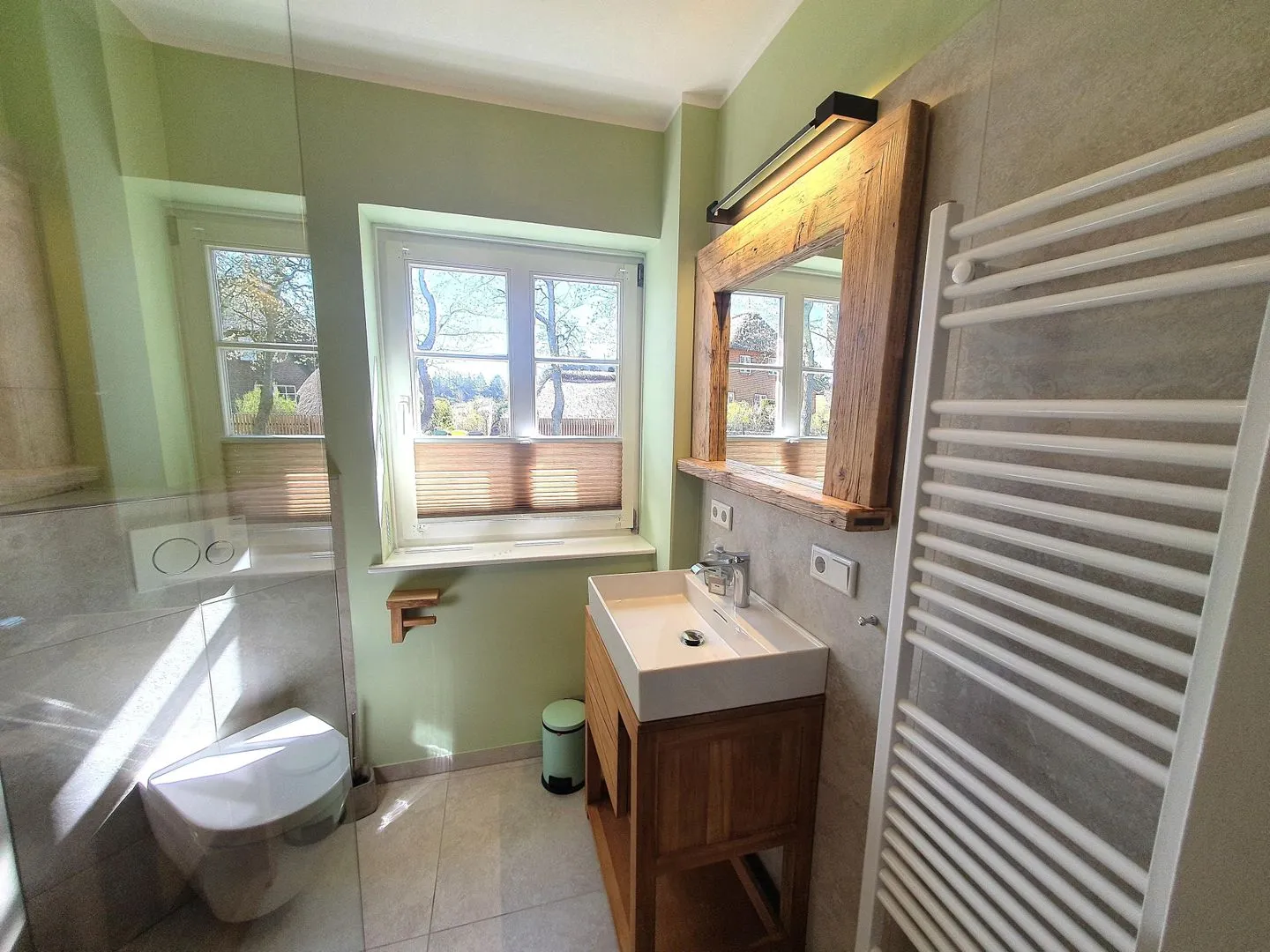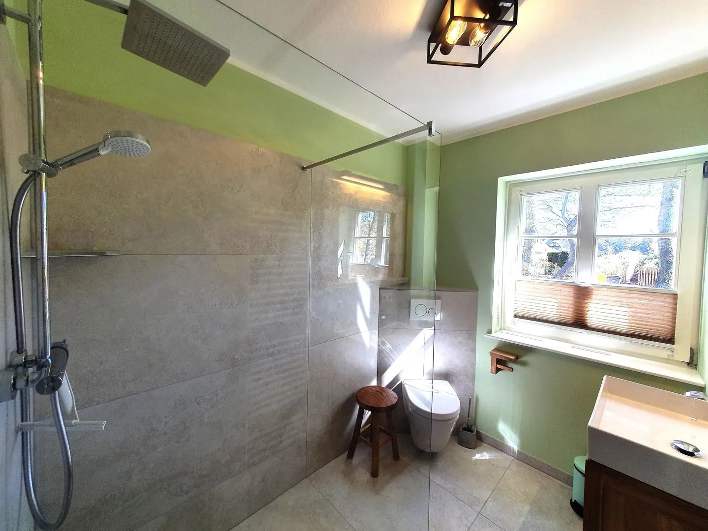 Das Badezimmer ist mit einer bodengleichen Dusche, WC und Waschbecken ausgestattet; warmes Wasser und Heizung sorgen für Komfort. Für längere Aufenthalte stehen Waschmaschine und Trockner gemeinschaftlich (gegen Gebühr) zur Nutzung bereit; Bügeleisen und Bügelbrett, Staubsauger sowie Rauchmelder ergänzen die Ausstattung.