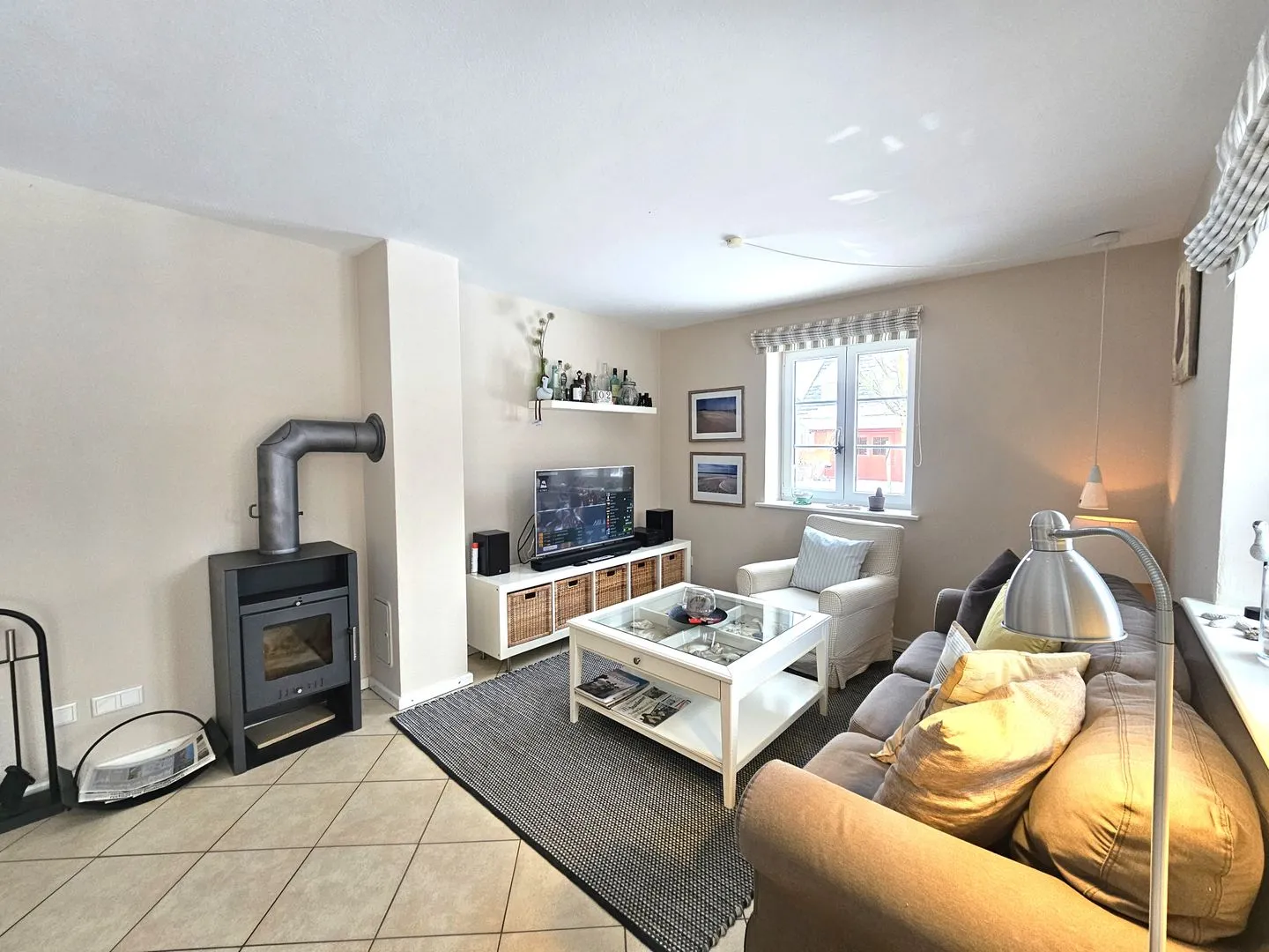 Im hellen Wohnzimmer sorgen Sofa und Sessel für gemütliche Stunden. Für Unterhaltung stehen 2 TVs sowie Radio, CD- und DVD-Spieler bereit. An kühleren Tagen schafft der Kaminofen eine angenehme Atmosphäre, während die Fußbodenheizung und die Heizung für durchgehend behagliche Wärme sorgen.