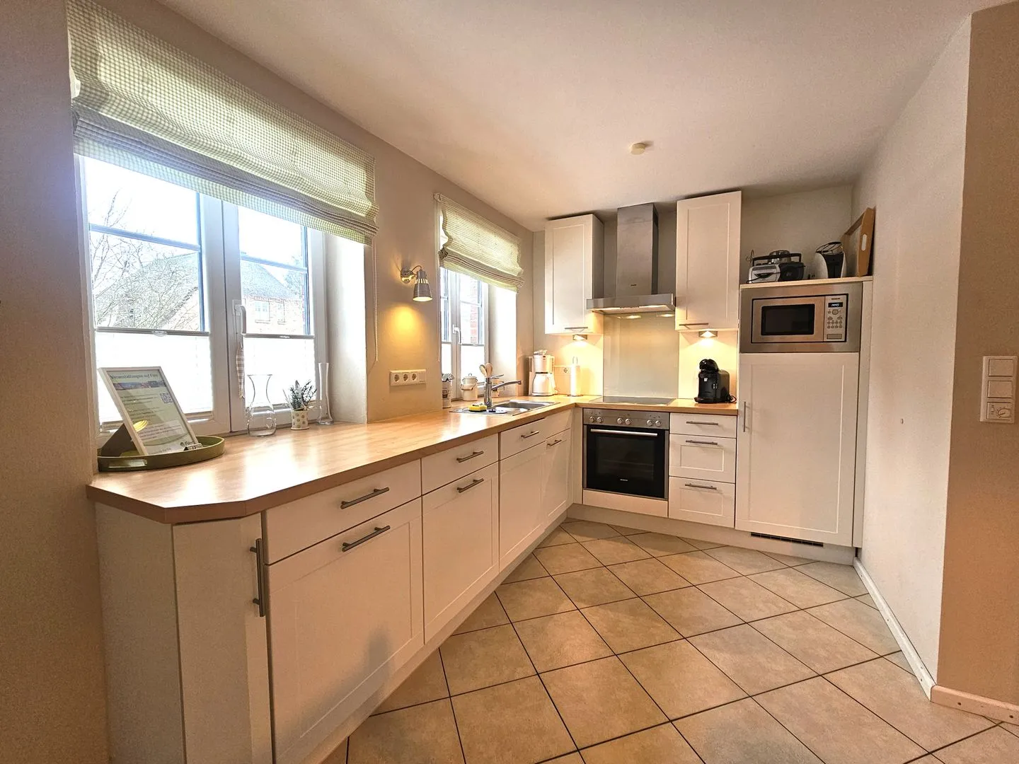 Die geschlossene Küche mit Esstisch ist separat gehalten und umfangreich ausgestattet: 4-Platten-Herd, Backofen, Mikrowelle, Kühlschrank mit Gefrierfach, Spülmaschine, Toaster, Wasserkocher und Kaffeemaschine sowie Geschirr, Besteck und Küchenutensilien. Für längere Aufenthalte stehen Ihnen Waschmaschine und Trockner zur Eigennutzung zur Verfügung; Bügeleisen und Bügelbrett ergänzen die praktische Ausstattung.
