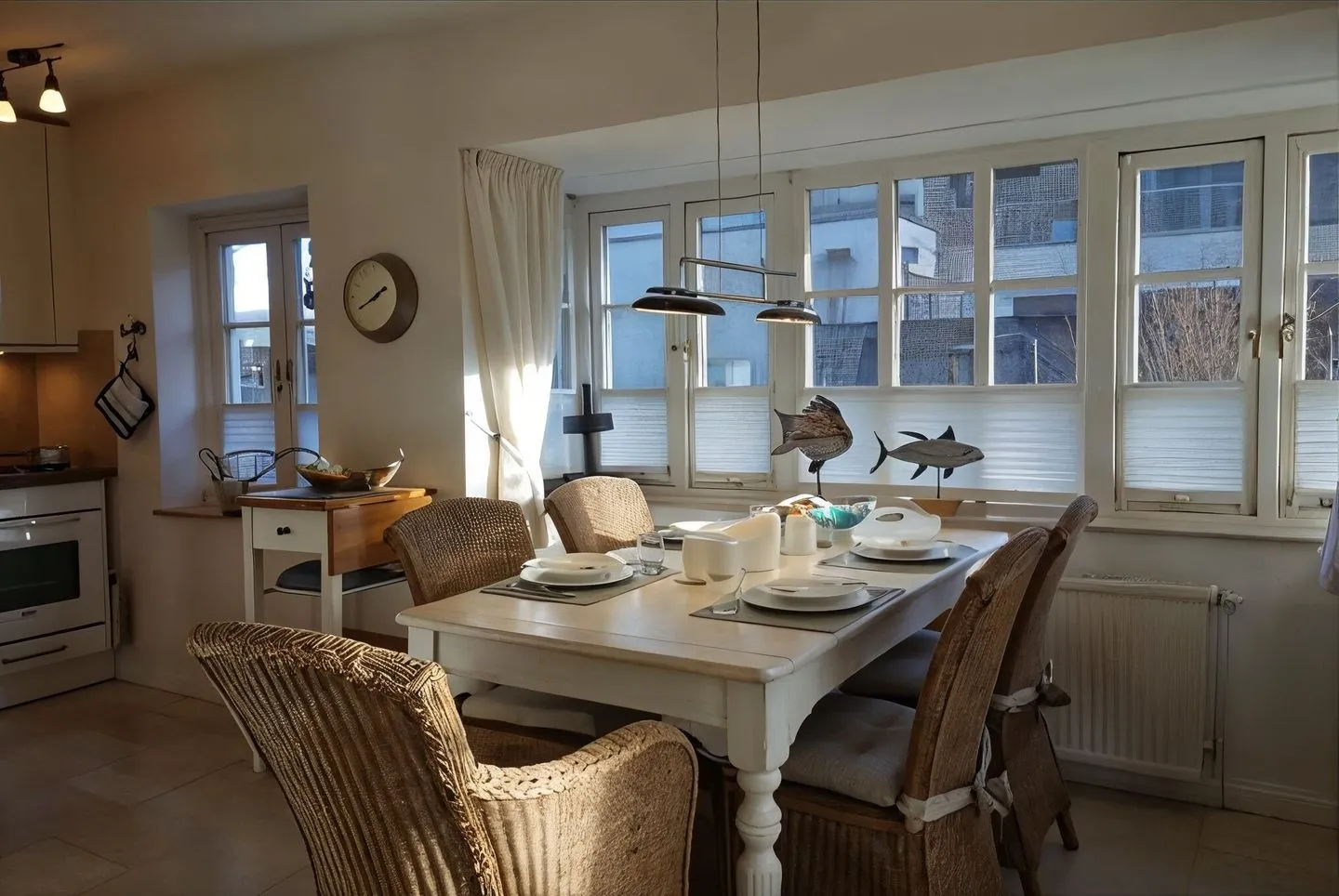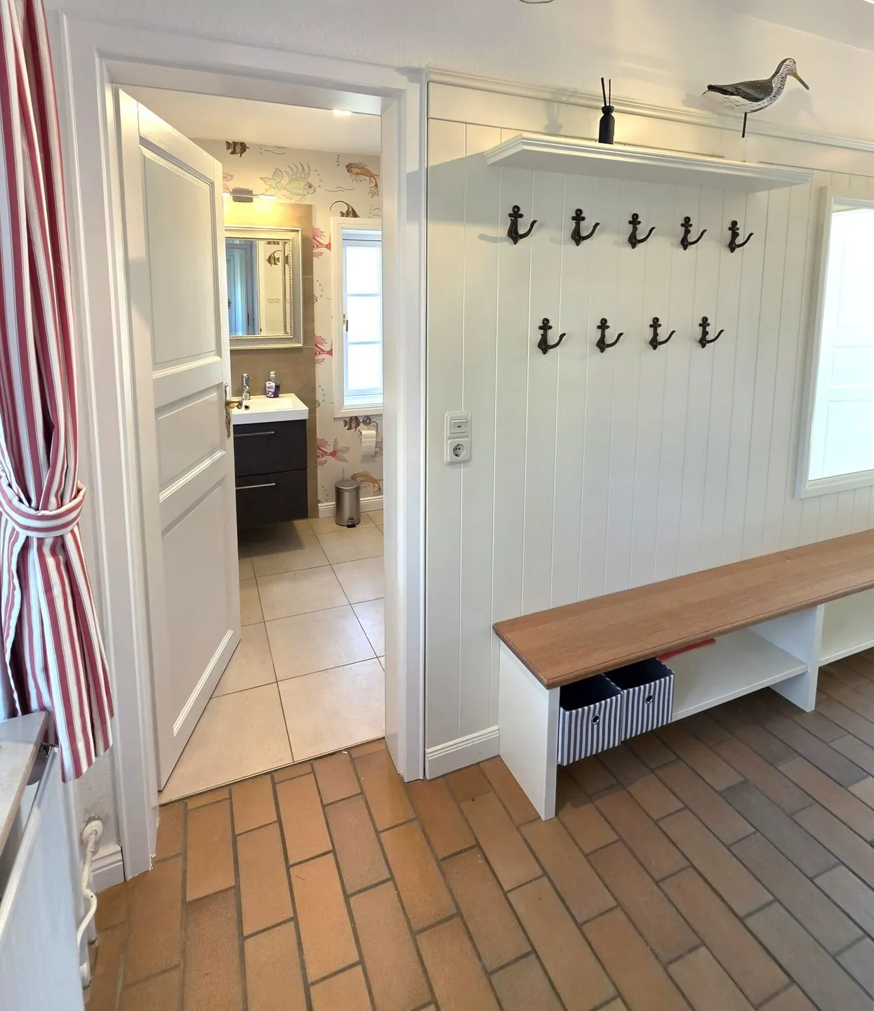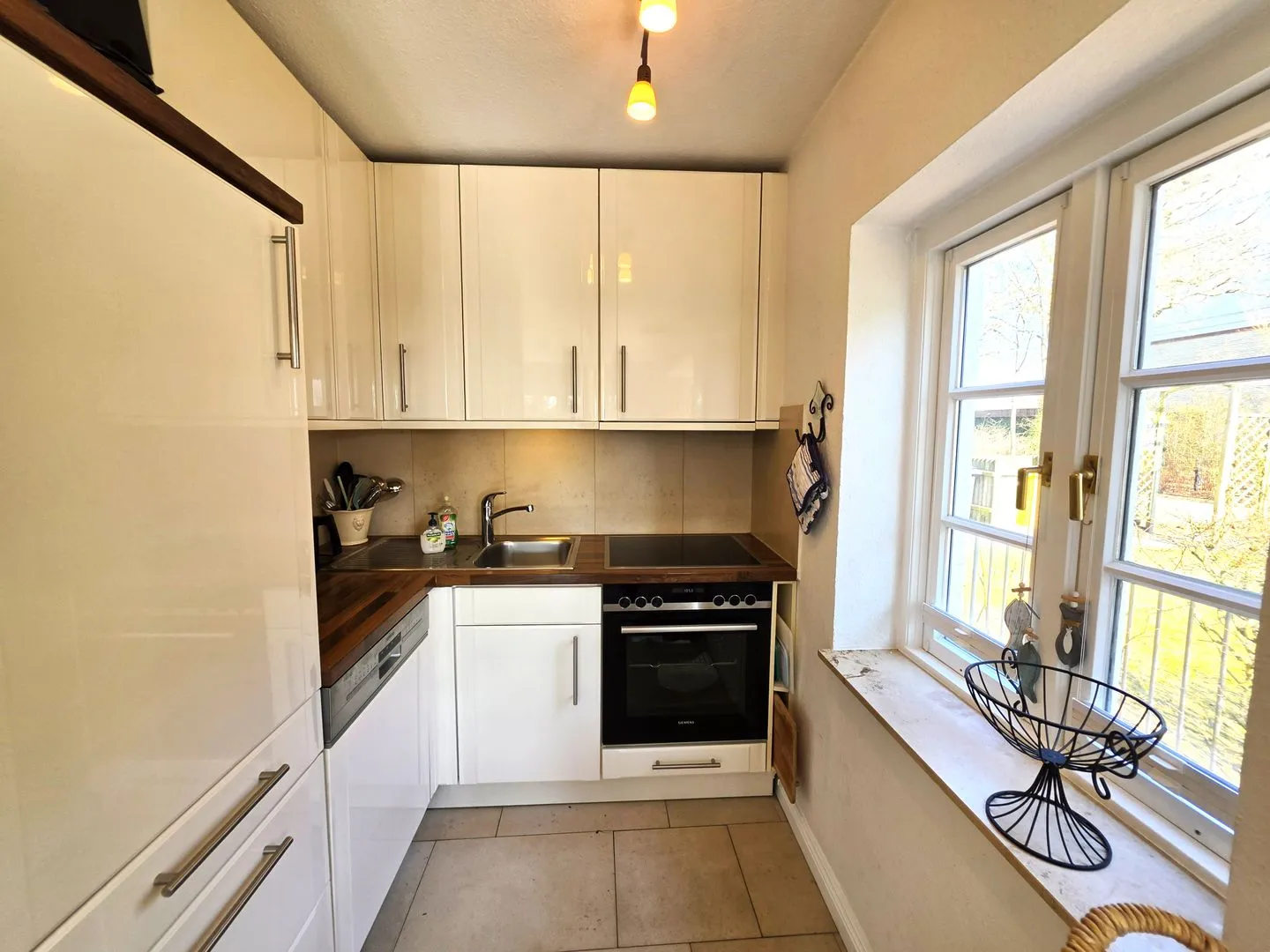 Die Küche ist offen zum Wohnzimmer gestaltet und vollständig ausgestattet: 4-Platten-Herd, Backofen, Kühlschrank mit Gefrierfach, Spülmaschine sowie Kaffeemaschine, Wasserkocher, Toaster und Küchenutensilien inklusive Geschirr und Besteck stehen bereit. Für längere Aufenthalte sind zudem Bügeleisen, Bügelbrett, Staubsauger sowie Haartrockner vorhanden. Waschmaschine und Trockner können gemeinschaftlich (gegen Gebühr) genutzt werden.