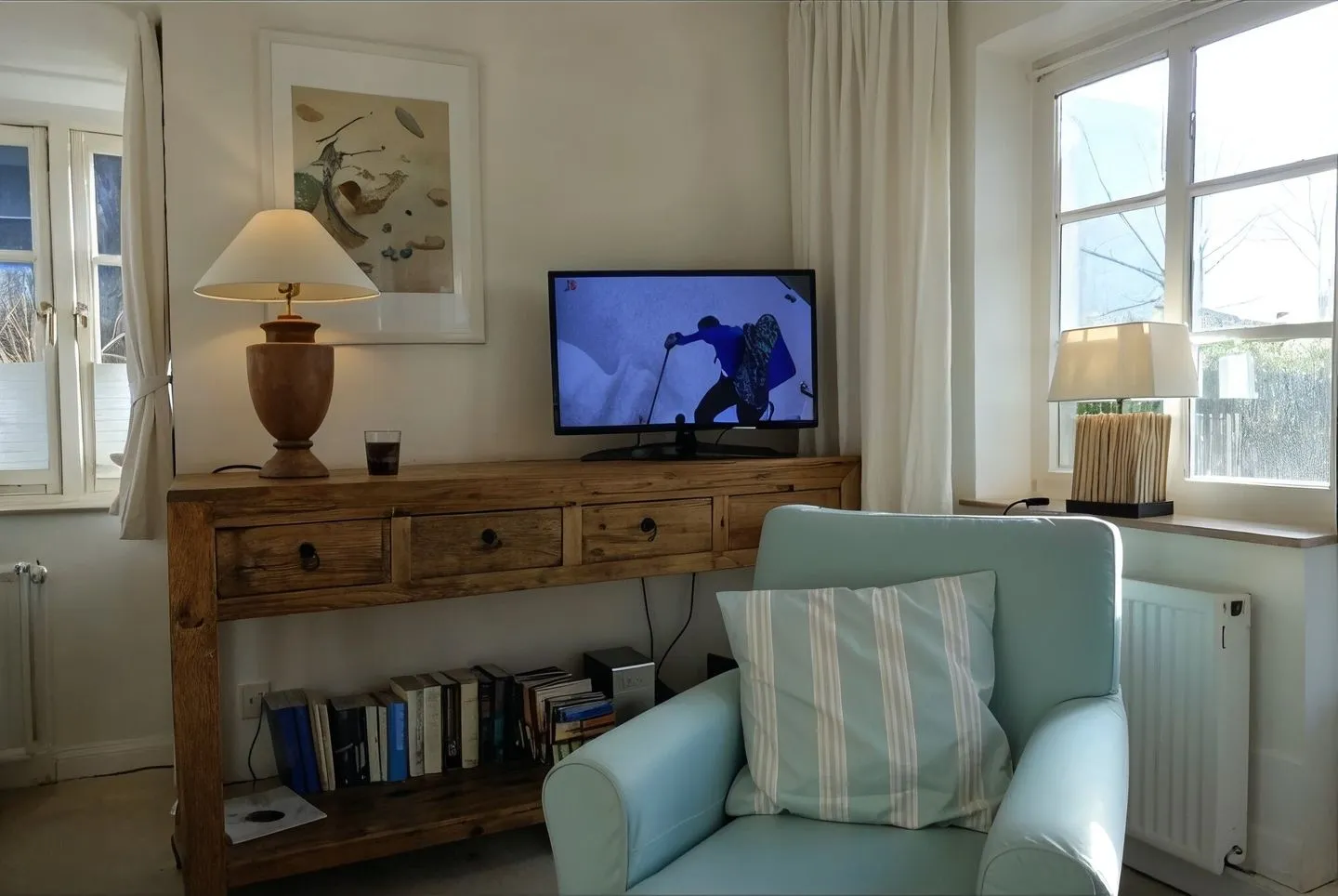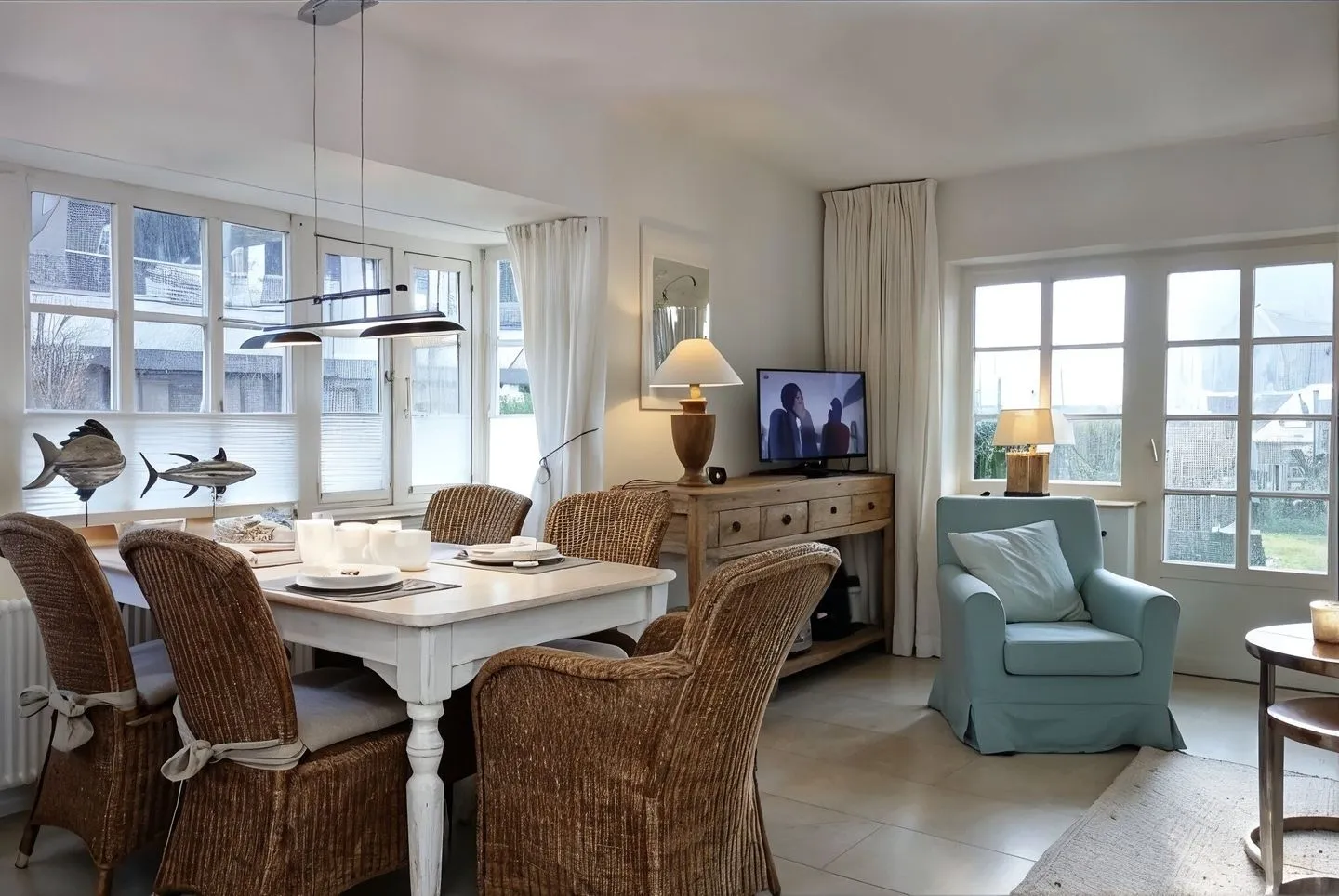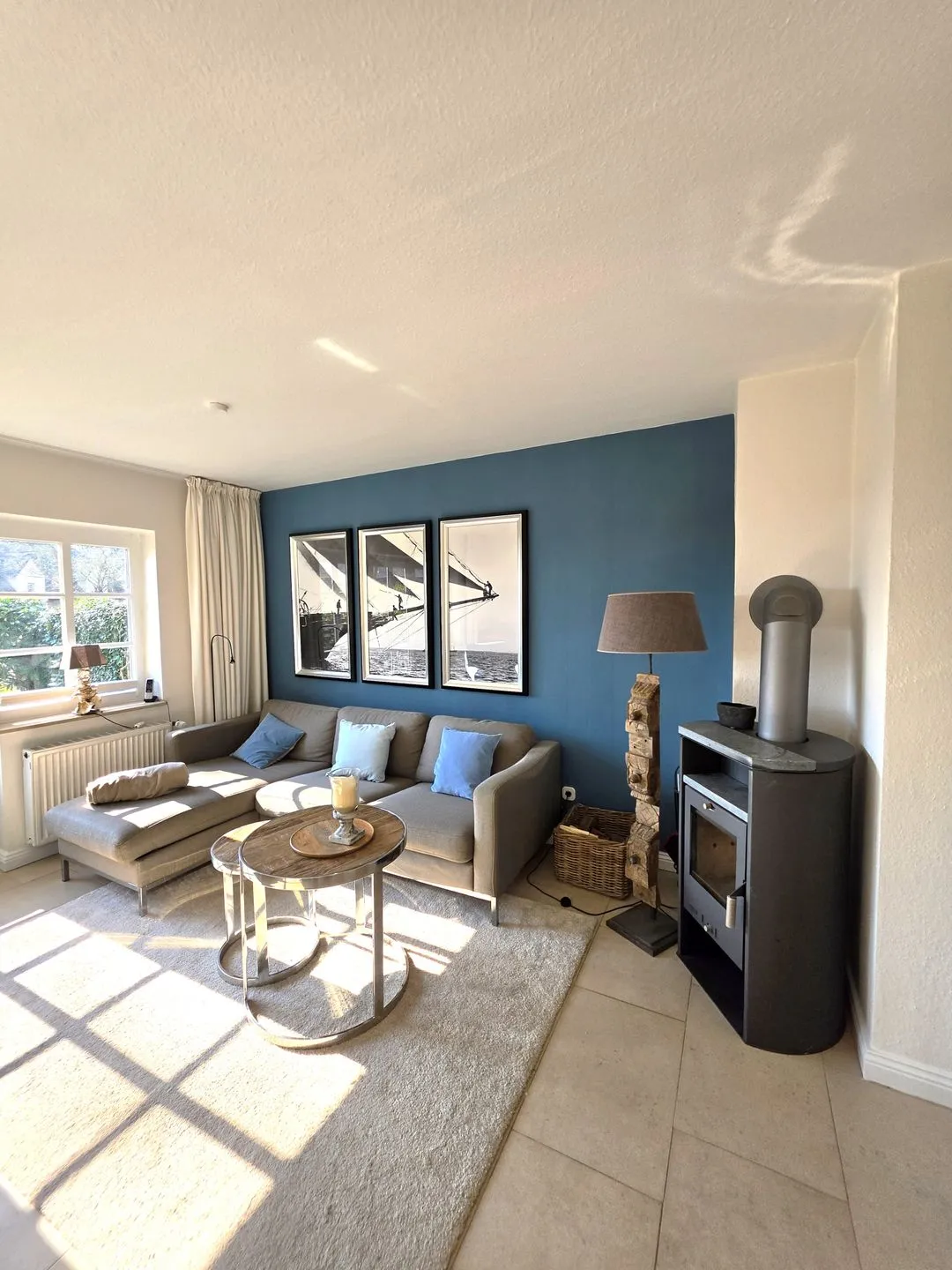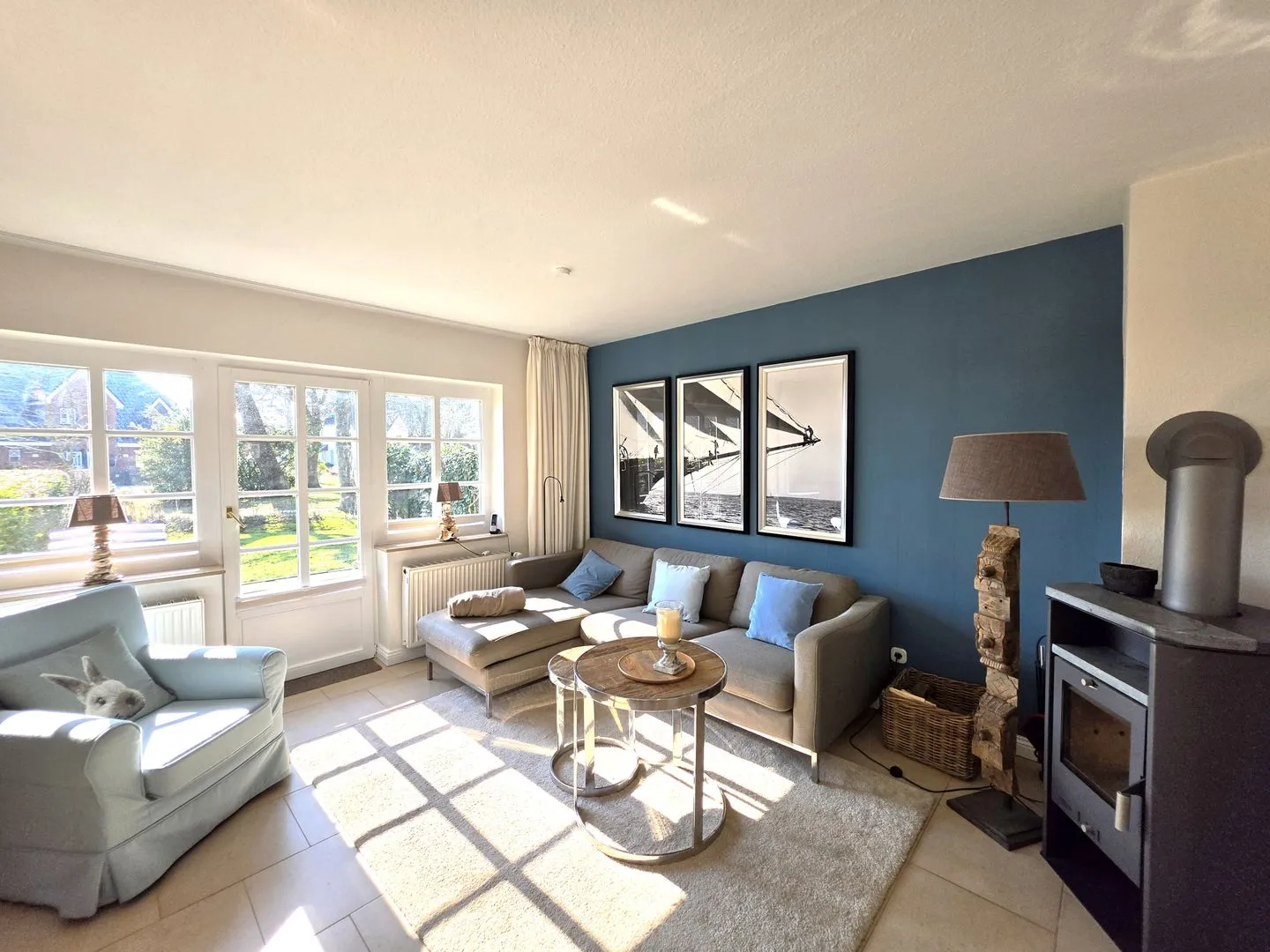 Der Wohnbereich im Parterre ist mit Sofa und TV ausgestattet. Für entspannte Abende sorgt ein Kaminofen. Internet und WLAN sind vorhanden, sodass Sie auch im Urlaub zuverlässig online bleiben können. Ein Essbereich mit Esstisch ist ebenfalls vorhanden.