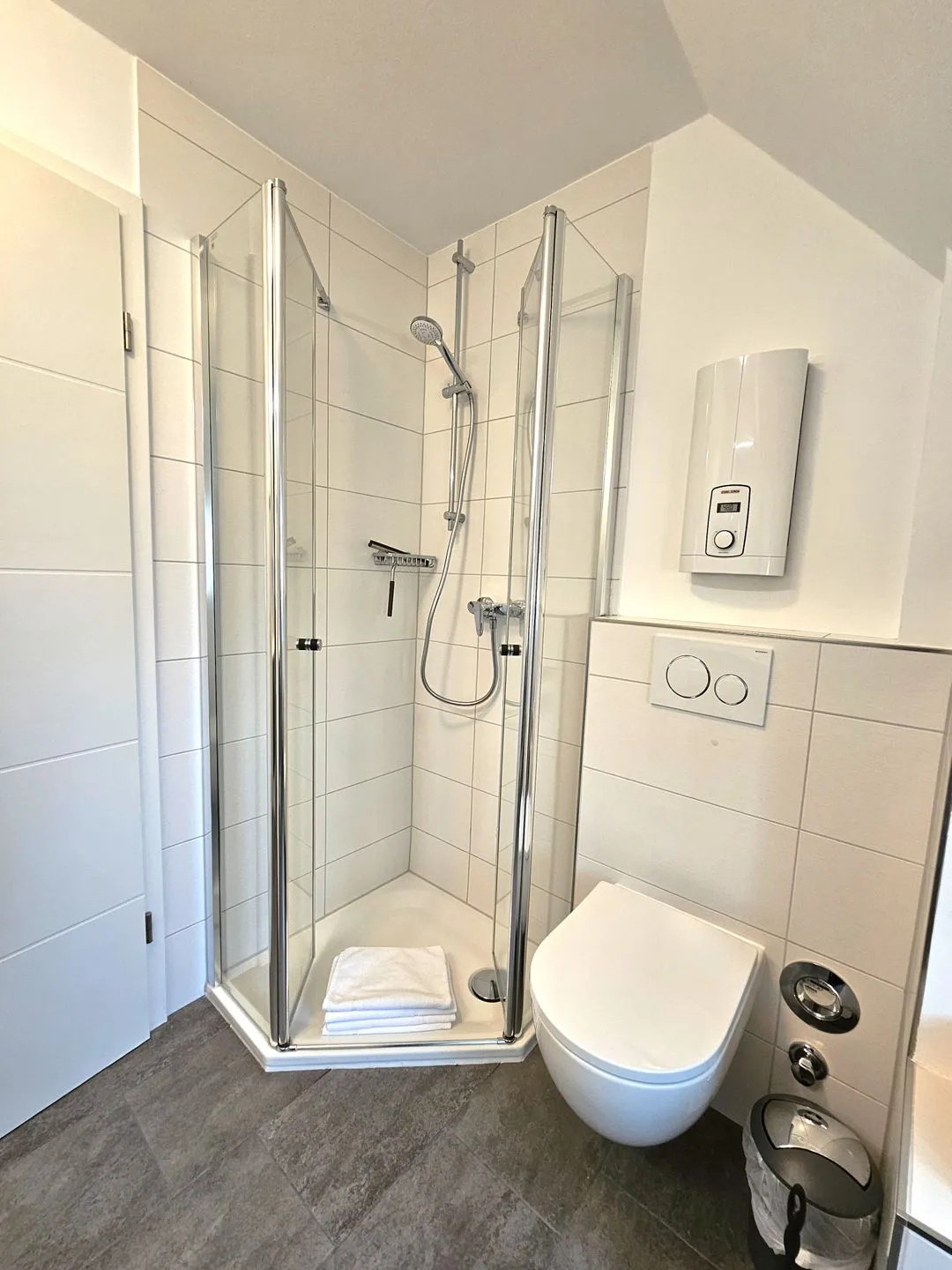 Das Badezimmer verfügt über eine bodengleiche Dusche, Waschbecken und WC; warmes Wasser und Heizung sorgen auch außerhalb der Sommermonate für Komfort. Waschmaschine und Trockner können gemeinschaftlich (gegen Gebühr) genutzt werden. Ein Balkon und der Garten bieten Ihnen zusätzliche Möglichkeiten, Zeit an der frischen Luft zu verbringen. Für die Anreise steht ein kostenloser Privatparkplatz (1 Stellplatz) zur Verfügung.