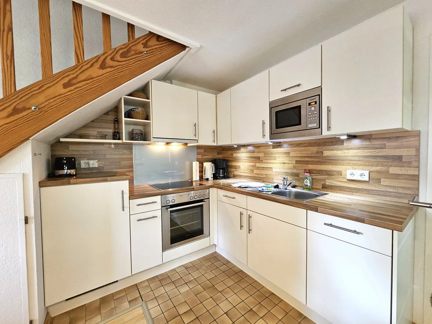 Der offene Wohnbereich verbindet Wohnen und Küche zu einem angenehmen Mittelpunkt des Urlaubsalltags. Für entspannte Abende sind ein TV, Radio und CD-Spieler vorhanden; WLAN/Internet steht Ihnen ebenfalls zur Verfügung. Die Küche ist umfassend ausgestattet: 4-Platten-Herd, Backofen, Mikrowelle, Kühlschrank mit Gefrierfach, Spülmaschine sowie Kaffeemaschine, Wasserkocher, Toaster und Küchenmaschine erleichtern die Selbstversorgung.