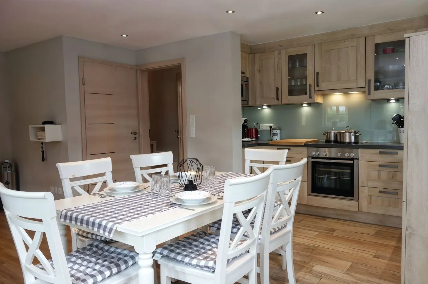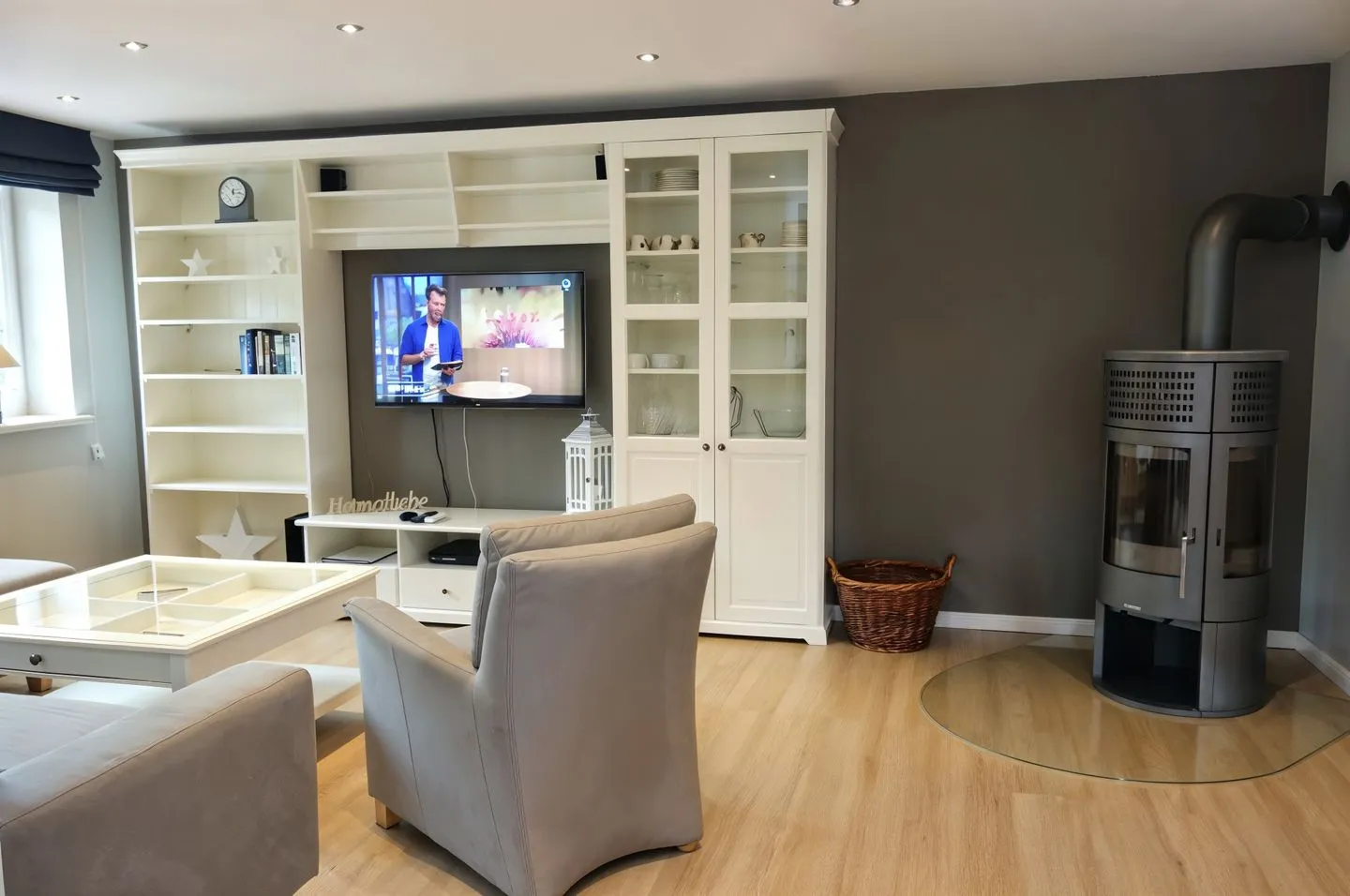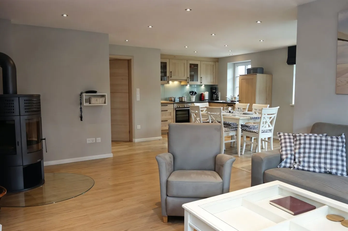 Der Wohnbereich ist mit einer offenen Küche zum Wohnzimmer gestaltet und schafft eine kommunikative Atmosphäre – perfekt für gemeinsame Mahlzeiten und entspannte Abende. Zur Ausstattung gehören ein 4-Platten-Herd, Backofen, Mikrowelle, Kühlschrank mit Gefrierfach, Spülmaschine sowie Toaster, Wasserkocher und Kaffeemaschine. Küchenutensilien sind vorhanden. Für gemütliche Stunden steht ein Kaminofen zur Verfügung; zudem sorgen Heizung und Fußbodenheizung für angenehme Wärme. Zur Unterhaltung gibt es WLAN/Internet, Radio und insgesamt 3 TVs. Ein separates Spielzimmer ergänzt das Angebot besonders attraktiv für Familien.