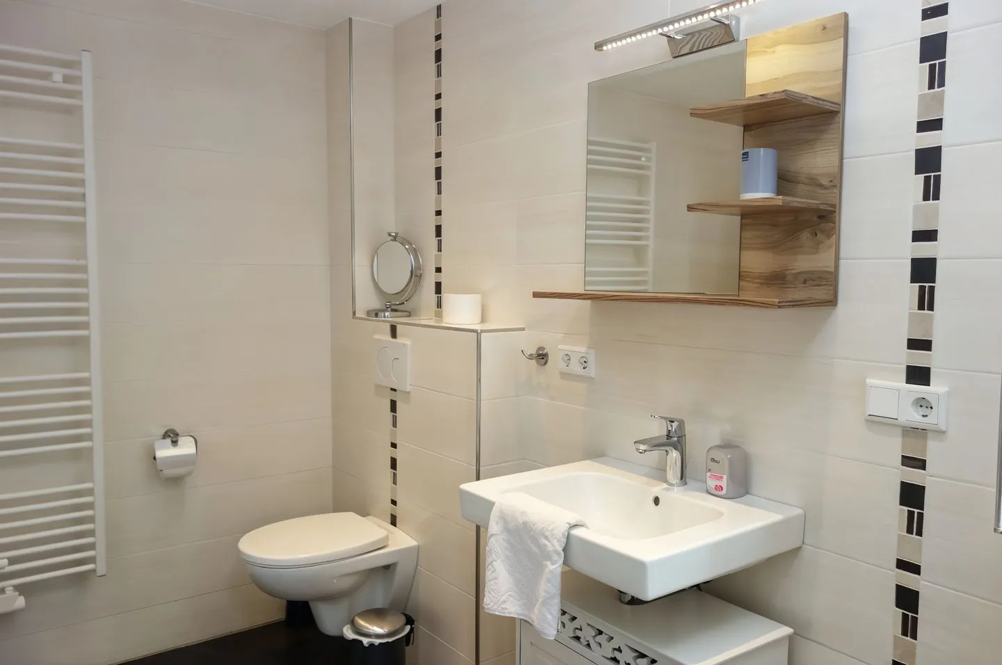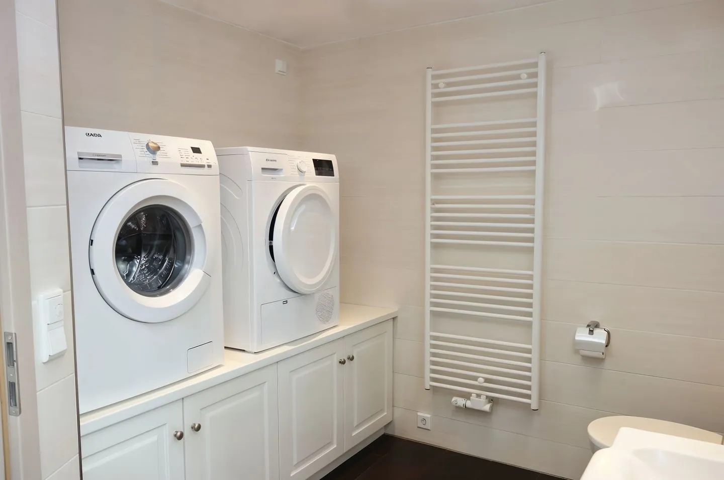 Beide Badezimmer sind praktisch ausgestattet: Es stehen 2 Duschen (bodengleich) zur Verfügung, zusätzlich gibt es eine Badewanne. Waschbecken, WC, Spiegel und warmes Wasser sind vorhanden. Für längere Aufenthalte ist die Eigennutzung von Waschmaschine und Trockner ein großer Vorteil; Bügeleisen und Bügelbrett sowie Staubsauger runden die Haushaltsausstattung ab.