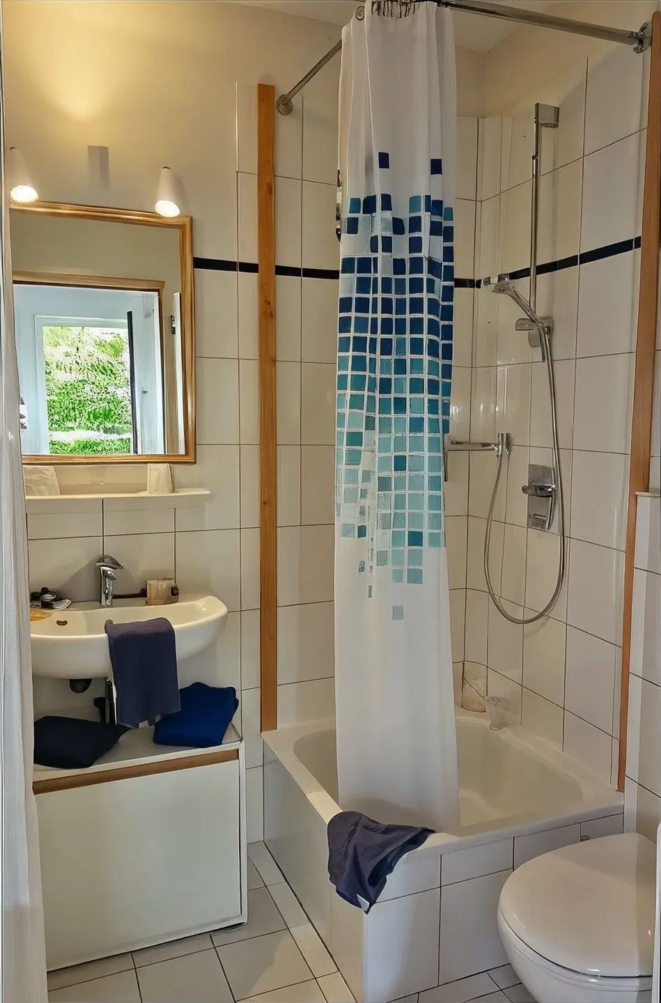 Im Badezimmer erwartet Sie eine bodengleiche Dusche sowie WC und Waschbecken. Für längere Aufenthalte oder zusätzliche Bequemlichkeit stehen Waschmaschine und Trockner gemeinschaftlich ( gegen Gebühr) zur Nutzung bereit; zusätzlich lädt eine Sauna ( gemeinschaftlich und gegne Gebühr) zum Entspannen ein.