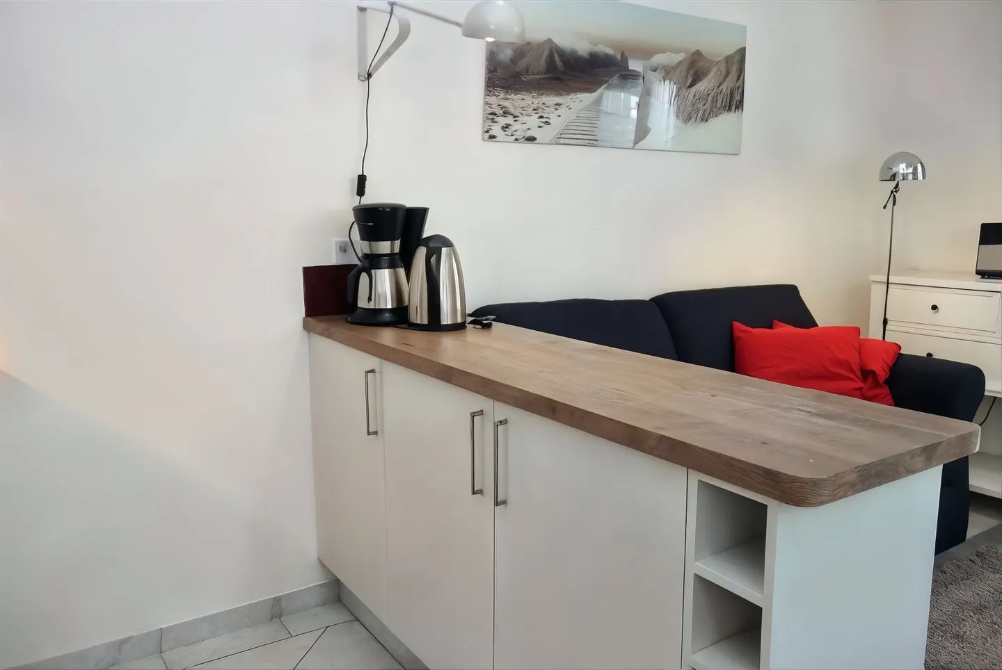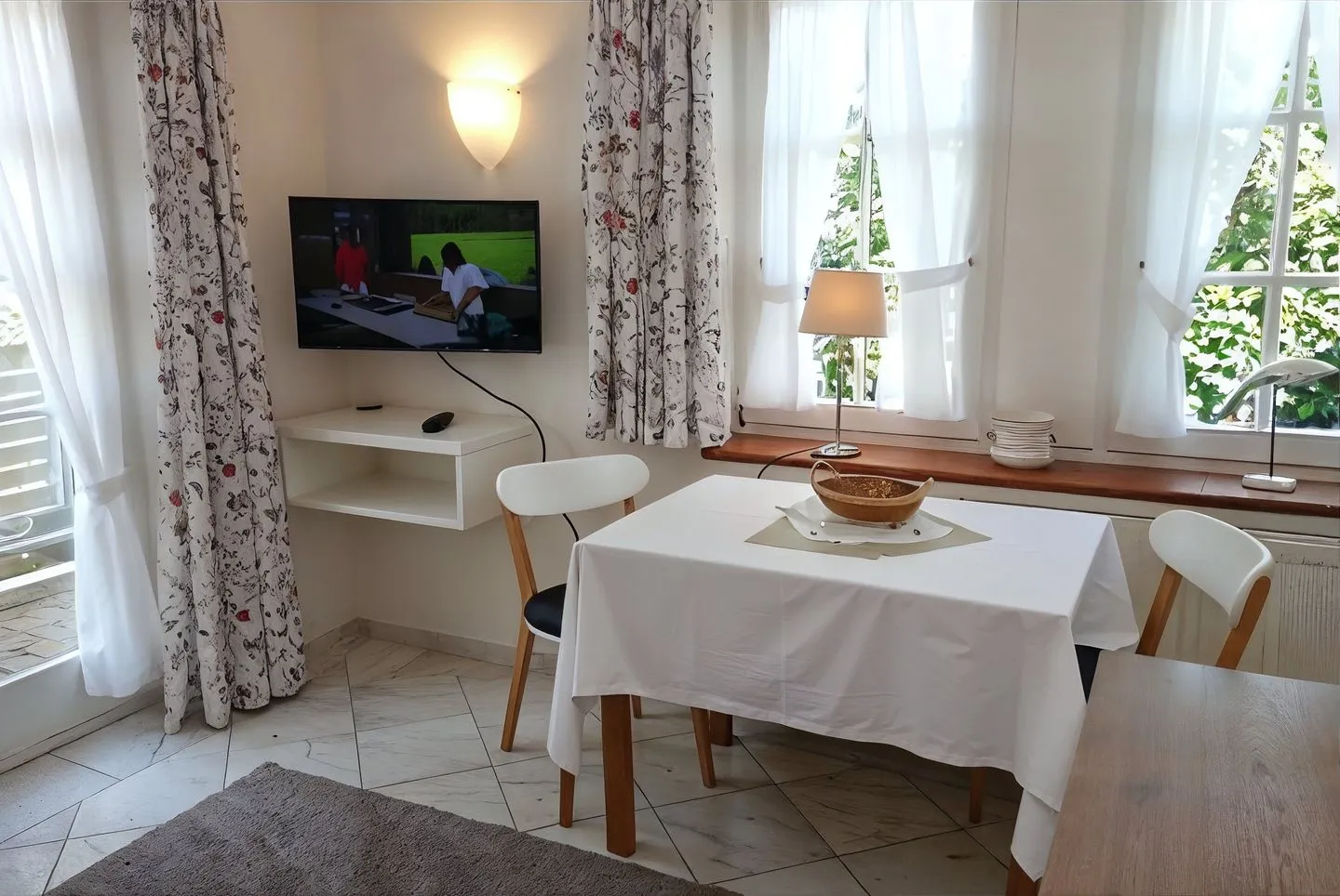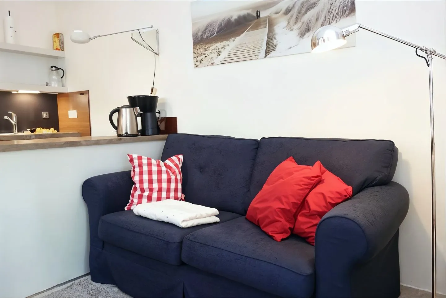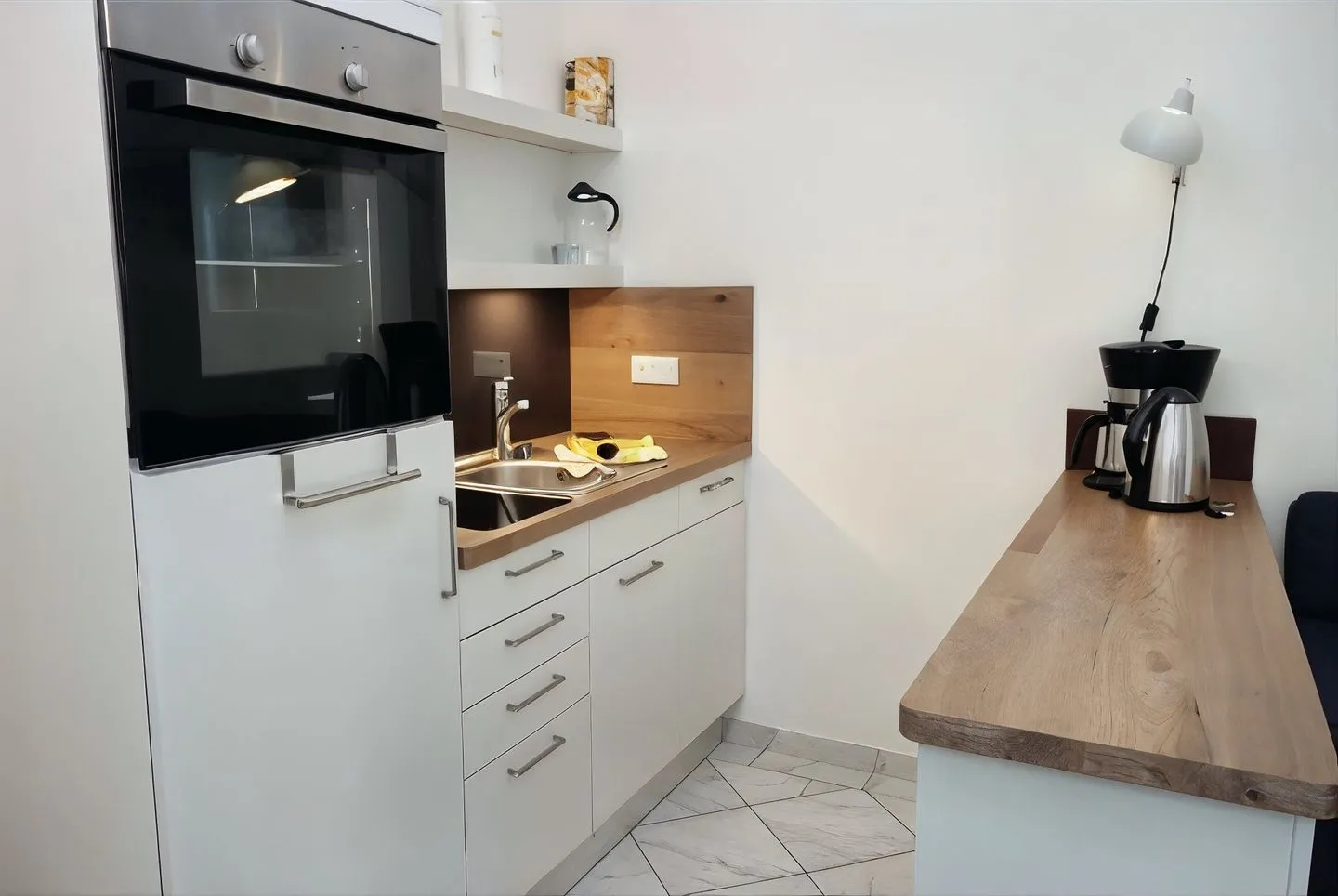 Der Wohnbereich ist offen gestaltet und mit der Küche zum Wohnzimmer hin verbunden. Ein Sofa, ein Essbereich mit Esstisch sowie ein TV sorgen für angenehme Stunden in der Wohnung. Für Ihre digitale Verbindung stehen Internet und WLAN zur Verfügung. Die Küche ist mit Herd (2-Platten), Backofen und Kühlschrank ausgestattet; außerdem sind Kaffeemaschine, Wasserkocher sowie Geschirr, Besteck und Küchenutensilien vorhanden – ideal, um Mahlzeiten flexibel selbst zuzubereiten.