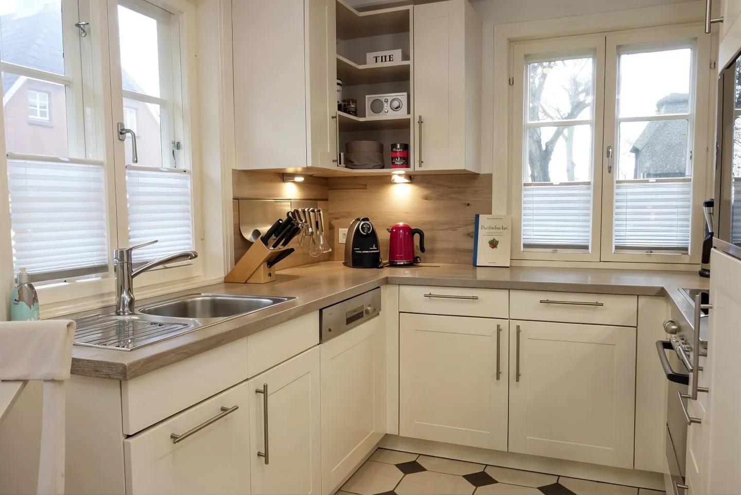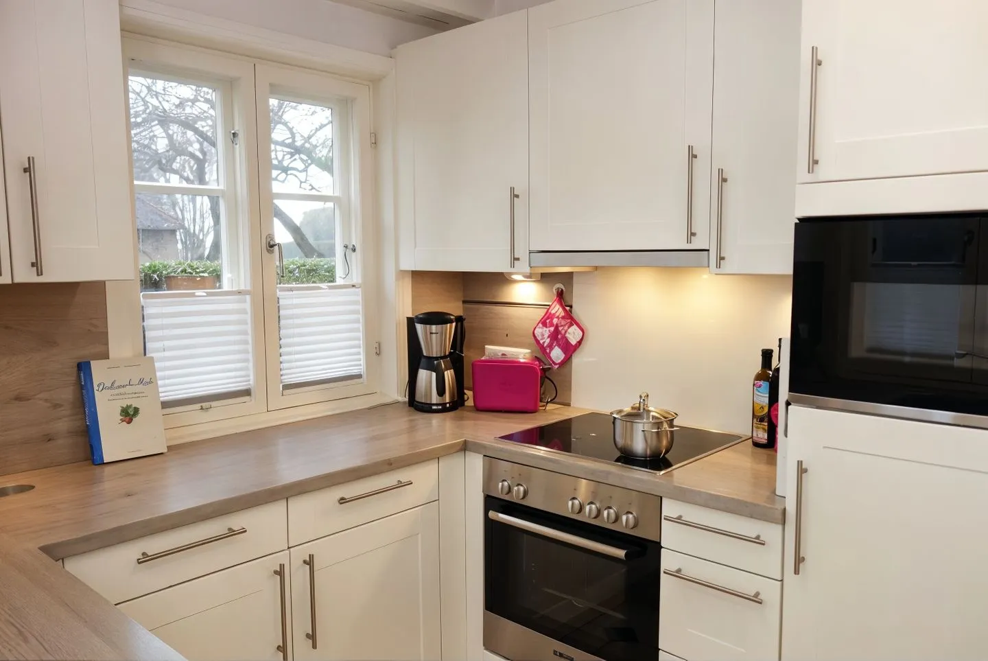 Die geschlossene Küche ist mit Esstisch und Essbereich ausgestattet und bietet alles, was Sie für die Selbstversorgung benötigen: 4-Platten-Herd, Backofen, Mikrowelle, Kühlschrank mit Gefrierfach, Spülmaschine sowie Küchenutensilien. Für den Start in den Tag stehen Kaffeemaschine, Wasserkocher und Toaster bereit. Zwei Badezimmer mit insgesamt zwei Duschen, WC und Waschbecken erleichtern die Abläufe – ideal, wenn Sie zu viert reisen.