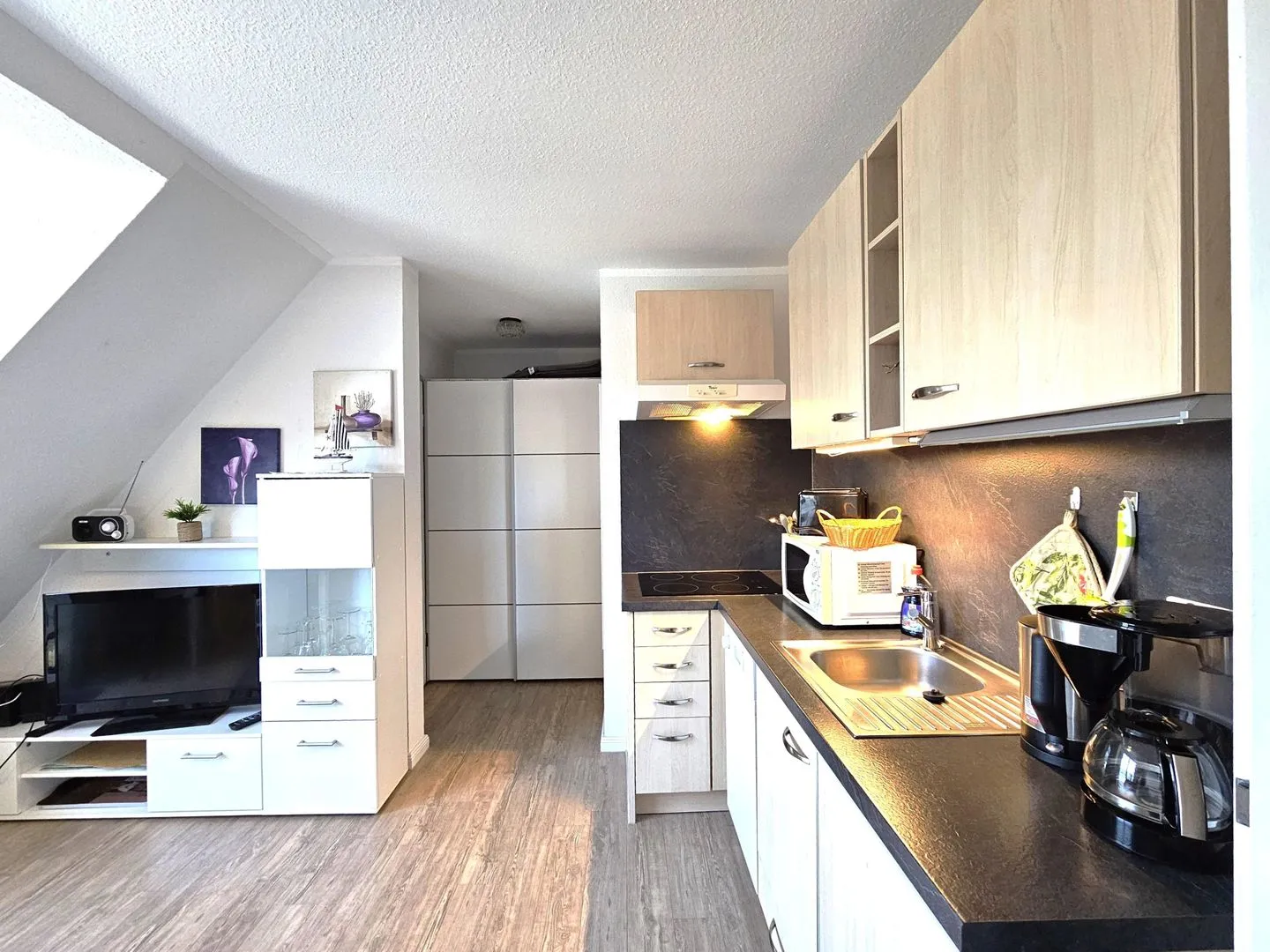 Der Wohnbereich ist mit TV und Radio ausgestattet und bietet mit Sofa und Sessel angenehmen Komfort. Die offene Küche zum Wohnzimmer macht den Raum besonders praktisch für gemeinsame Mahlzeiten: Essbereich und Esstisch sind vorhanden. Für die Selbstversorgung stehen Herd mit 4-Platten-Kochfeld, Backofen und Mikrowelle sowie Kühlschrank mit Gefrierfach, Spülmaschine, Kaffeemaschine, Wasserkocher und Toaster bereit; Geschirr, Besteck und Küchenutensilien sind ebenfalls vorhanden.