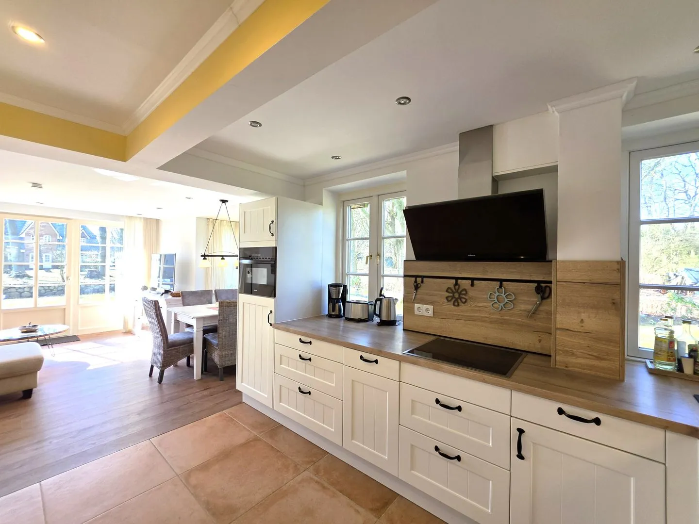 Der Wohnbereich befindet sich im Parterre und ist mit der offenen, zum Wohnzimmer integrierten Küche verbunden. Hier stehen Ihnen ein 4-Platten-Herd, Backofen, Mikrowelle, Kühlschrank mit Gefrierfach, Spülmaschine sowie Küchenutensilien, Geschirr und Besteck zur Verfügung. Ein Esstisch mit Essbereich schafft den passenden Rahmen für gemeinsame Mahlzeiten. Zur Unterhaltung sind 2 TVs sowie ein Radio vorhanden; WLAN/Internet ist ebenfalls verfügbar.