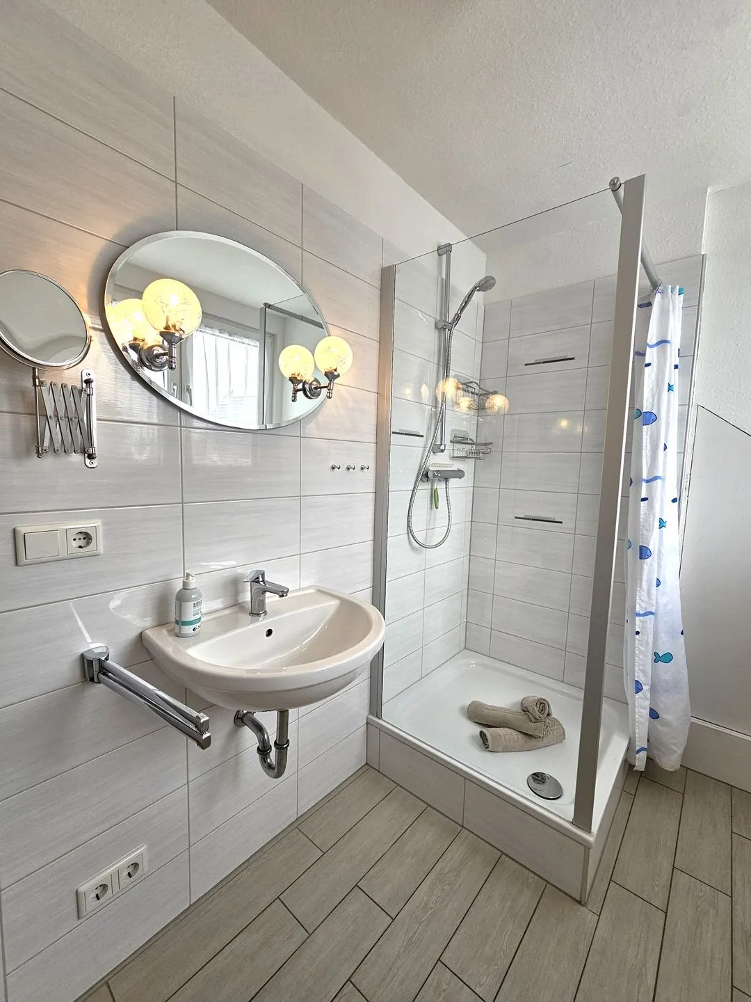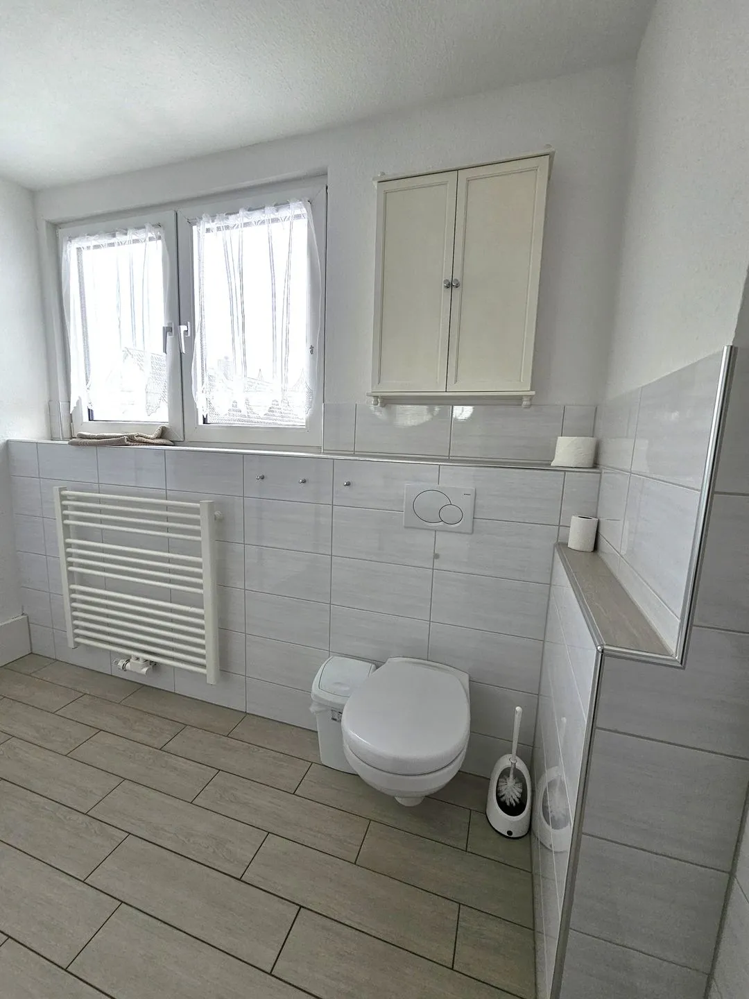 Die Wohnung verfügt über 3 Schlafzimmer und 1 Badezimmer mit Dusche, WC und Waschbecken; warmes Wasser und Heizung sind vorhanden. Für längere Aufenthalte oder Reisen mit Kindern ist die gemeinschaftliche Nutzung von Waschmaschine und Trockner eine praktische Ergänzung (gegen Gebühr).