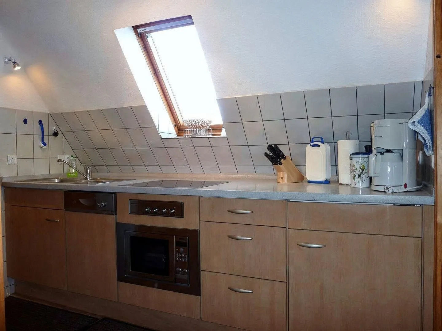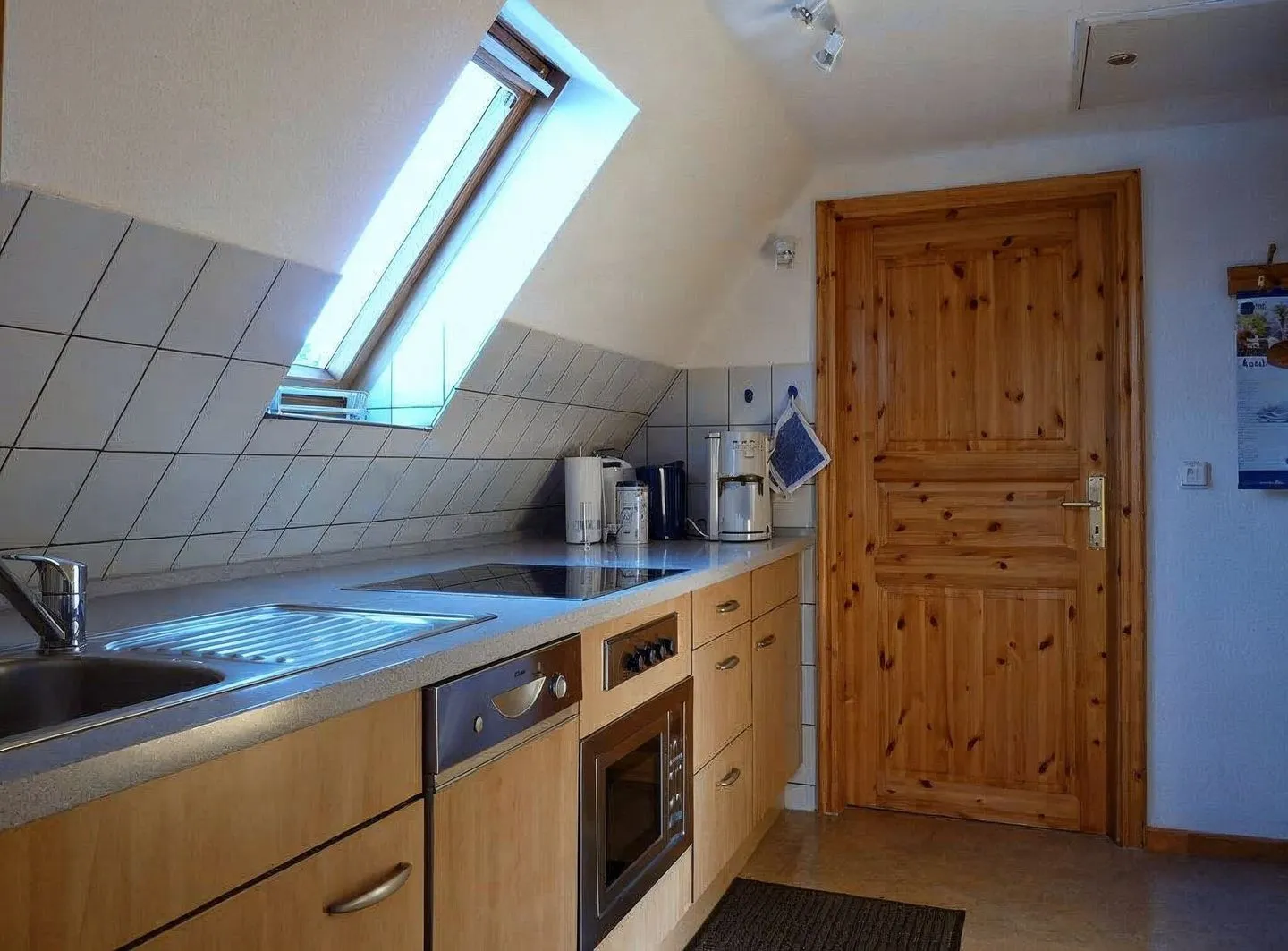 Die geschlossene Küche ist umfassend ausgestattet und macht Selbstversorgung unkompliziert: Herd mit 4-Platten-Kochfeld, Mikrowelle, Kühlschrank mit Gefrierfach, Spülmaschine sowie Kaffeemaschine, Wasserkocher und Toaster sind vorhanden. Ein Essbereich mit Esstisch rundet den Wohnkomfort ab; Geschirr, Besteck und Küchenutensilien stehen bereit.