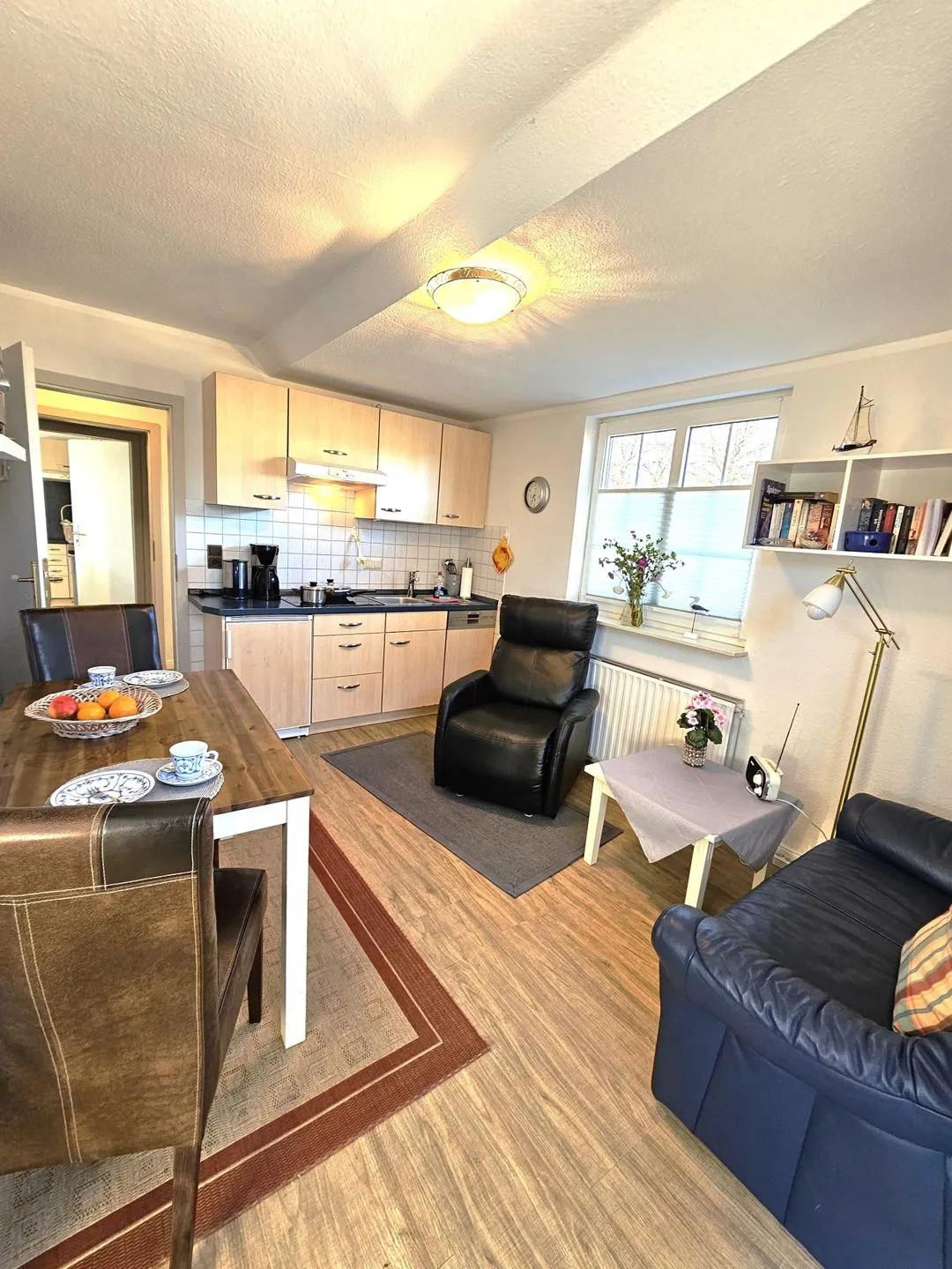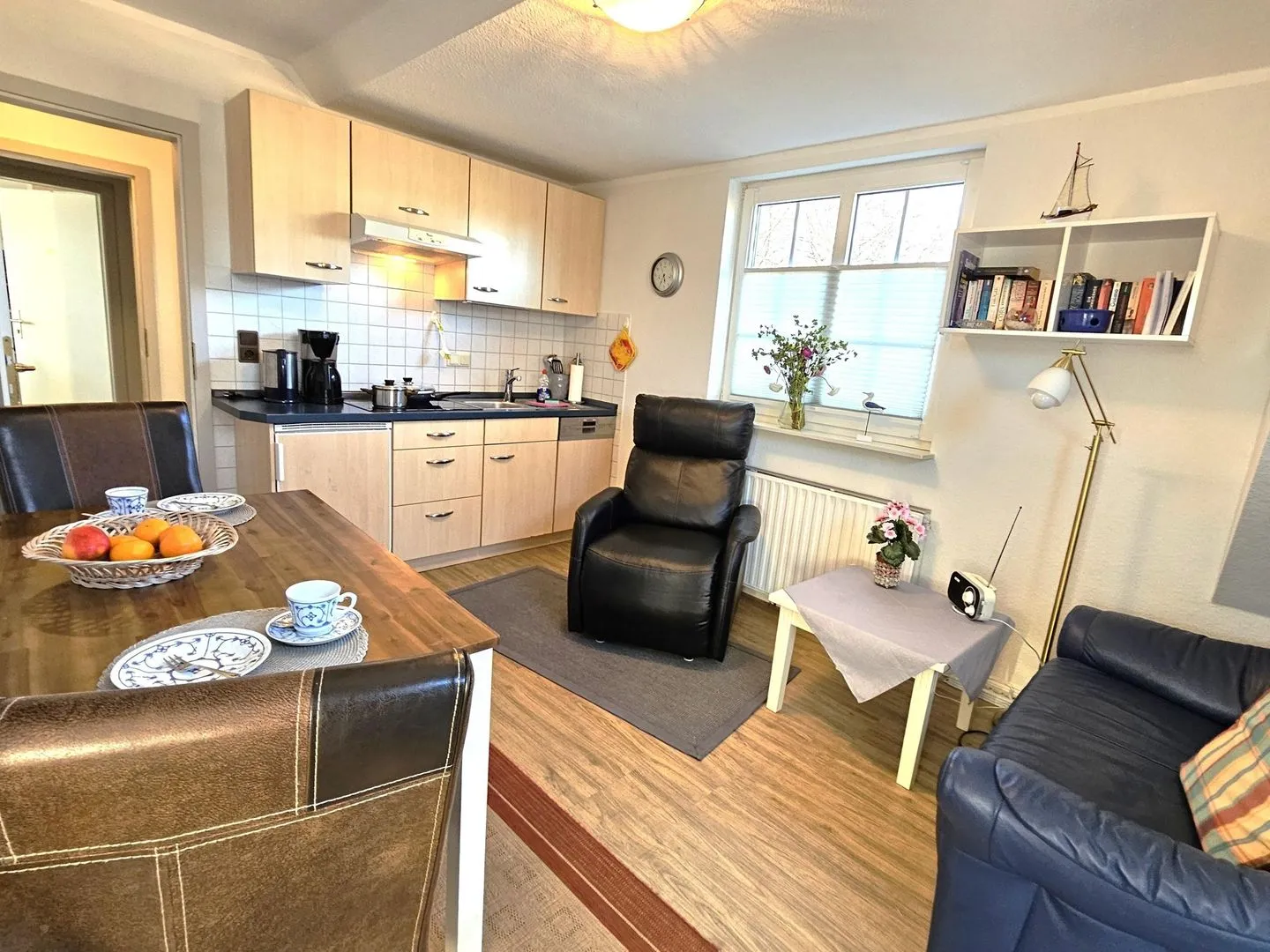 Für die Selbstversorgung steht eine Küche in Form einer Kochnische bereit. Diese ist mit einem 4-Platten-Herd, Kühlschrank, Spülmaschine, Kaffeemaschine und Wasserkocher ausgestattet. Geschirr, Besteck und Küchenutensilien sind ebenfalls vorhanden. Ein separater Essbereich mit Esstisch macht gemeinsame Mahlzeiten zu zweit unkompliziert und angenehm.
