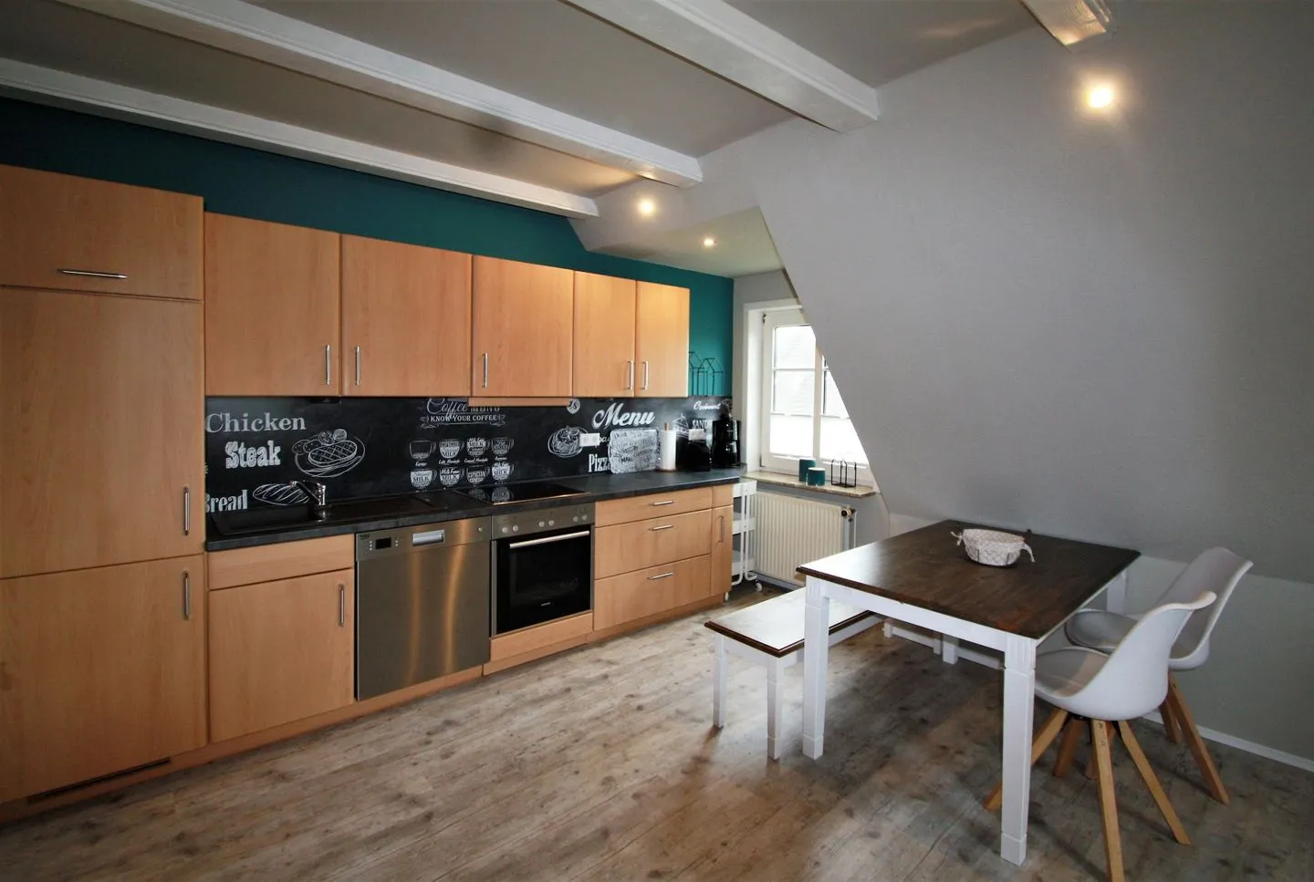 Der Wohnbereich lädt mit Sofa, TV und Radio zum Entspannen ein. Die offene Küche ist zum Wohnzimmer hin gestaltet und ermöglicht gemeinsames Kochen und Beisammensein. Zur Ausstattung gehören Herd mit 4-Platten-Kochfeld und Backofen, Kühlschrank mit Gefrierfach, Spülmaschine sowie Kaffeemaschine, Wasserkocher, Toaster, Geschirr, Besteck und Küchenutensilien. Ein Essbereich mit Esstisch ist vorhanden und macht Mahlzeiten in der Wohnung angenehm unkompliziert.