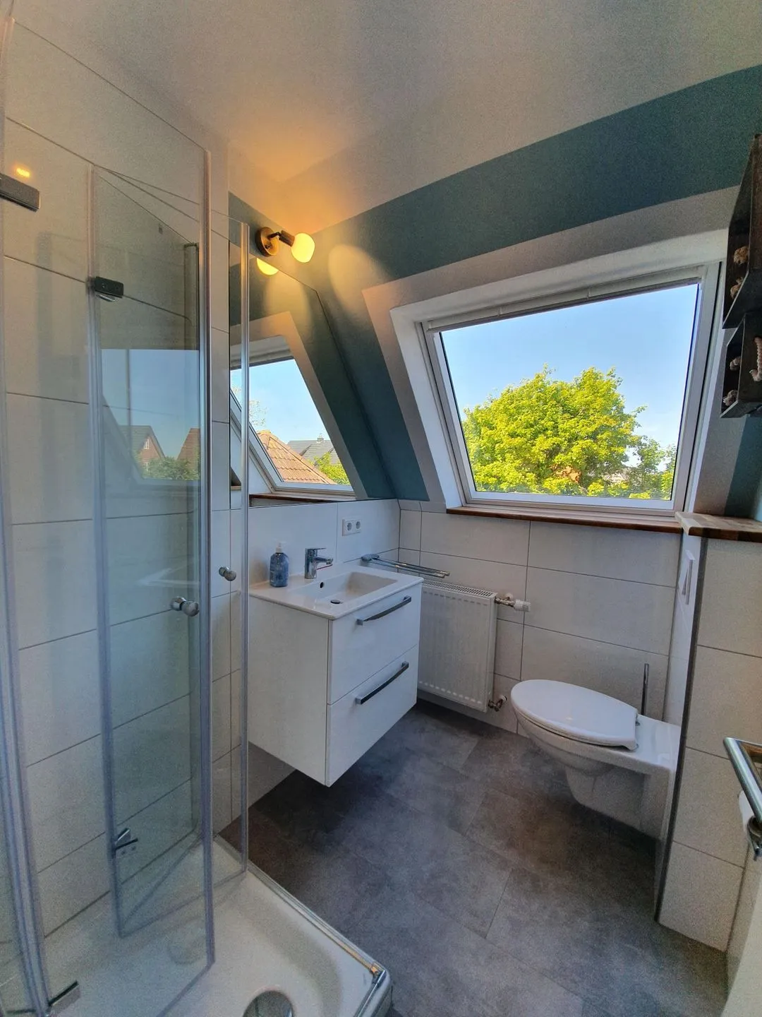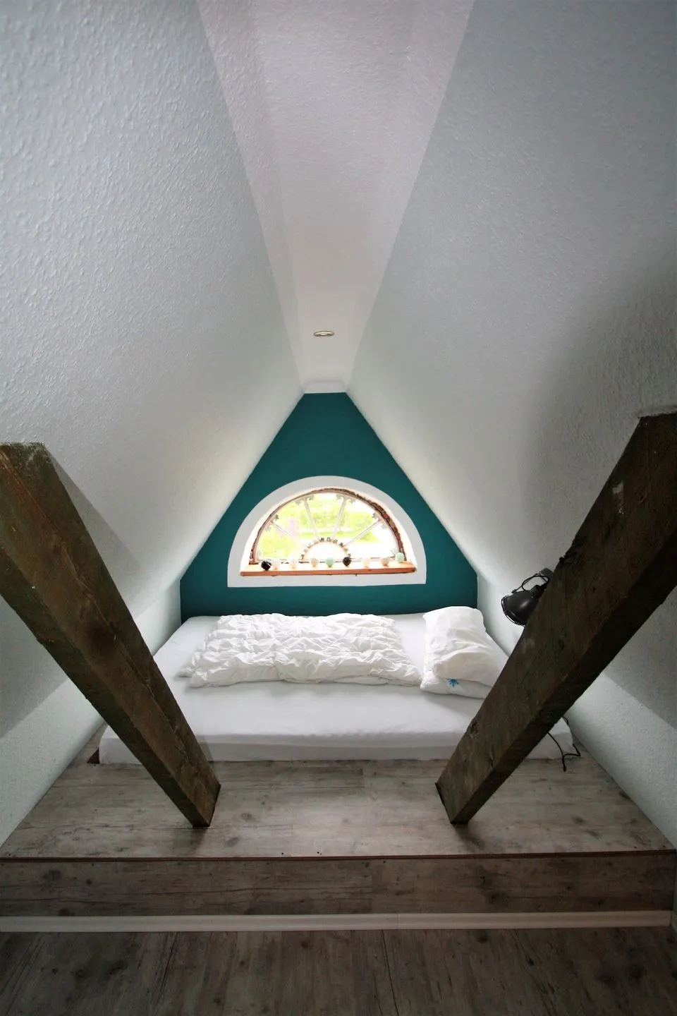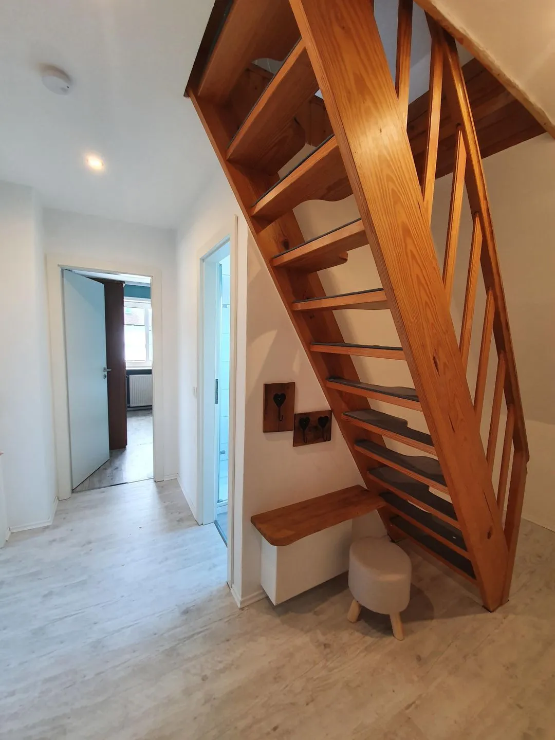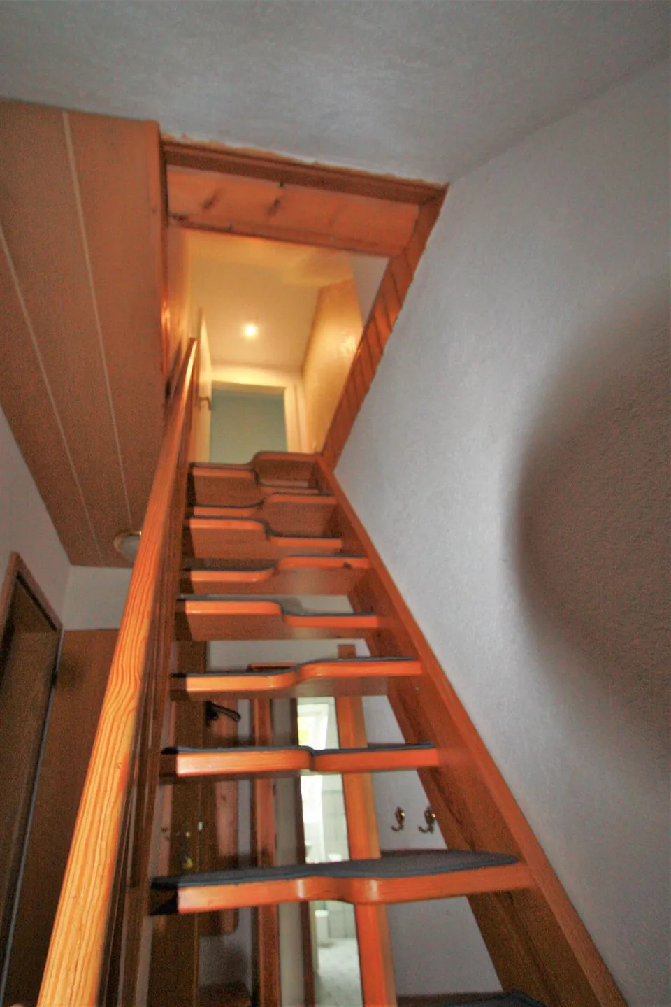 Bitte beachten Sie, dass es sich bei der Treppe, die in das Schlafzimmer im 2. OG führt, um eine Raumspartreppe mit versetzten Stufen handelt.