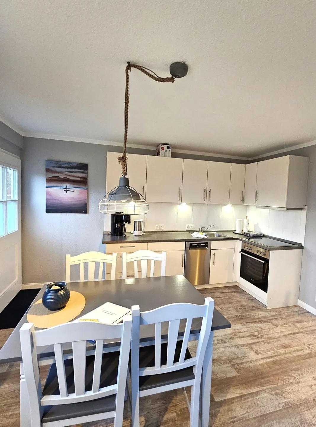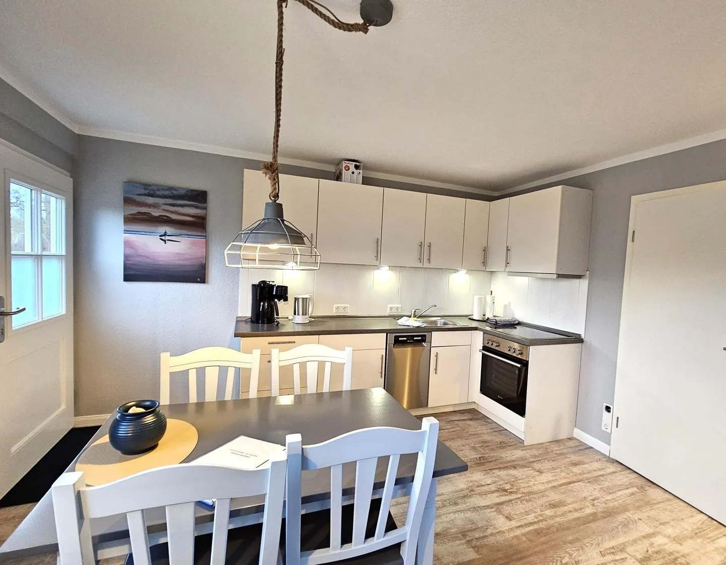 Der Wohnbereich ist mit TV und Radio ausgestattet und geht in eine offen zum Wohnzimmer gestaltete Küche über. Hier finden Sie alles, was Sie für die Selbstversorgung benötigen: 4-Platten-Herd, Backofen, Kühlschrank mit Gefrierfach, Spülmaschine sowie Toaster, Wasserkocher und Kaffeemaschine. Essbereich und Esstisch sind vorhanden, ebenso Geschirr, Besteck und Küchenutensilien. Für zusätzlichen Komfort stehen Garderobe, Kommode, Spiegel sowie praktische Haushaltshelfer wie Staubsauger, Wäscheständer, Bügelbrett und Bügeleisen bereit.
