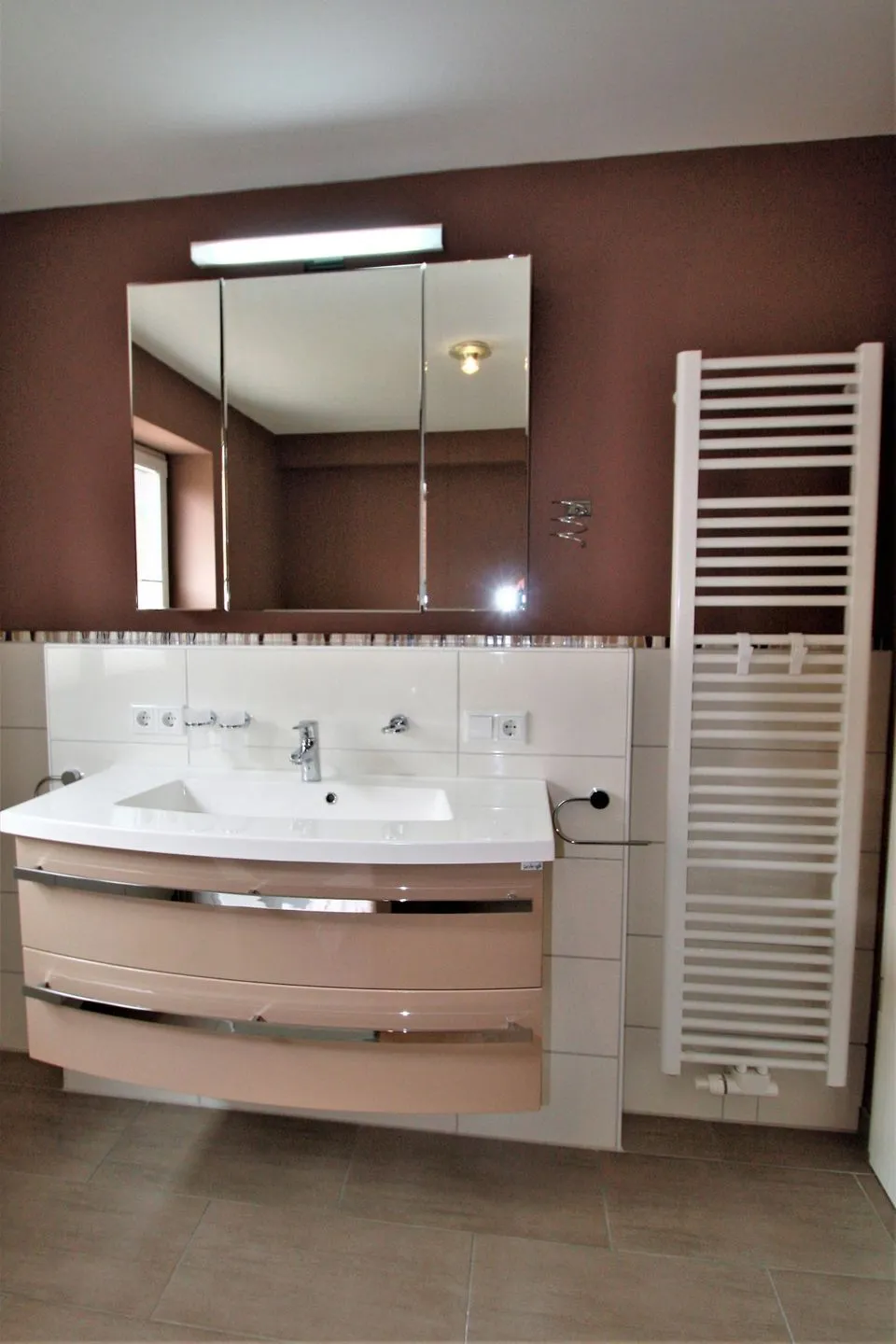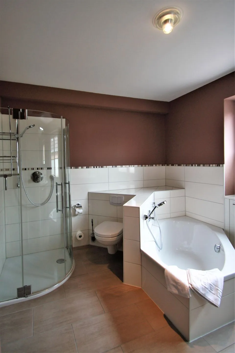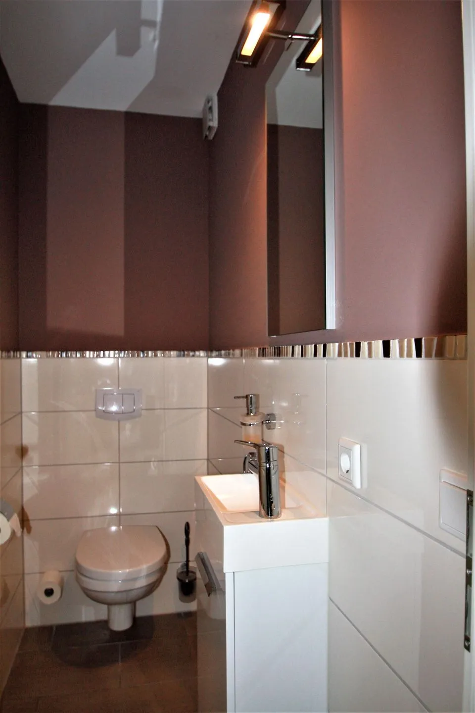 Im Badezimmer finden Sie sowohl eine bodengleiche Dusche als auch eine Badewanne; zusätzlich gibt es ein Gäste-WC. Warme Wasserversorgung, Heizung und Fußbodenheizung sorgen für Komfort. Praktische Details wie Haartrockner, Spiegel und Ganzkörperspiegel, Garderobe, Staubsauger sowie Bügeleisen und Bügelbrett unterstützen einen entspannten Alltag. Für längere Aufenthalte stehen Waschmaschine und Trockner zur Eigennutzung bereit, ebenso ein Wäscheständer.