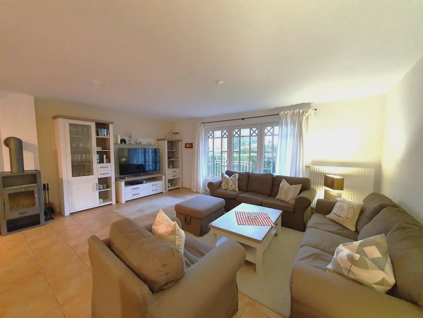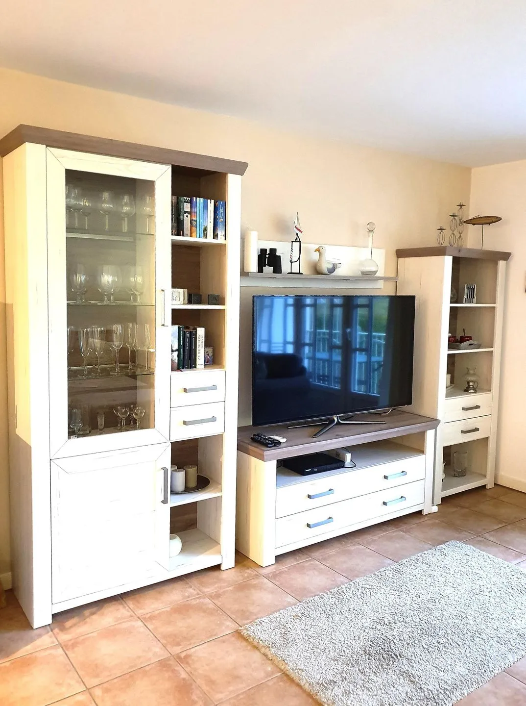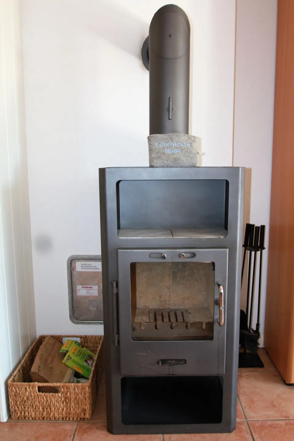Der Wohnbereich ist als Wohnzimmer mit offen zum Wohnzimmer gestalteter Küche angelegt und lädt zum gemeinsamen Kochen, Essen und Verweilen ein. Zur Küchenausstattung gehören ein 4-Platten-Herd mit Backofen, Mikrowelle, Kühlschrank mit Gefrierfach, Spülmaschine sowie Kaffeemaschine, Wasserkocher, Toaster und umfangreiche Küchenutensilien inklusive Geschirr und Besteck. Ein Esstisch mit Essbereich ist vorhanden. Für gemütliche Stunden steht ein Kaminofen zur Verfügung; außerdem sind TV und Radio vorhanden. WLAN/Internet ist ebenfalls verfügbar.