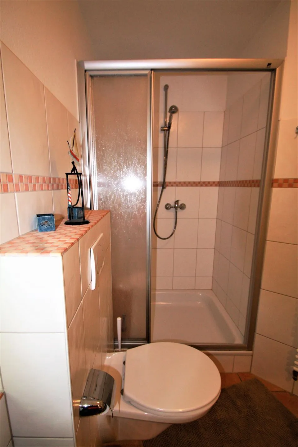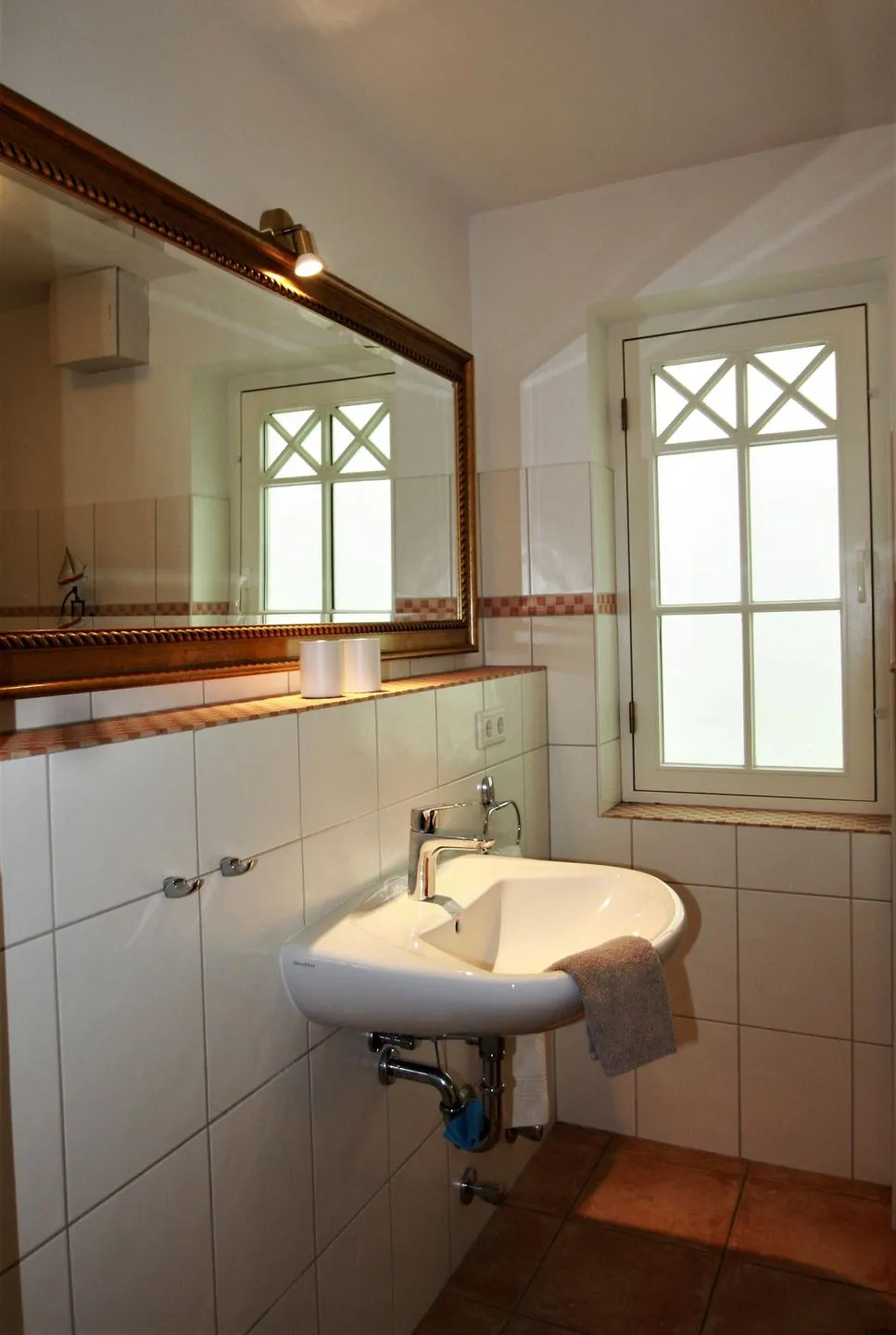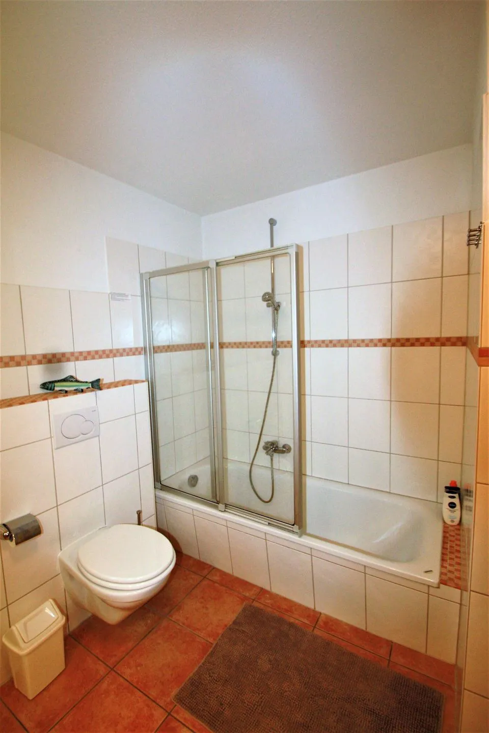 Insgesamt stehen 2 Badezimmer zur Verfügung, einmal mit Dusche, einmal mit Badewanne. Praktisch für längere Aufenthalte: Waschmaschine und Trockner können gemeinschaftlich genutzt werden (gegen Gebühr); Bügeleisen und Bügelbrett sind ebenfalls vorhanden.