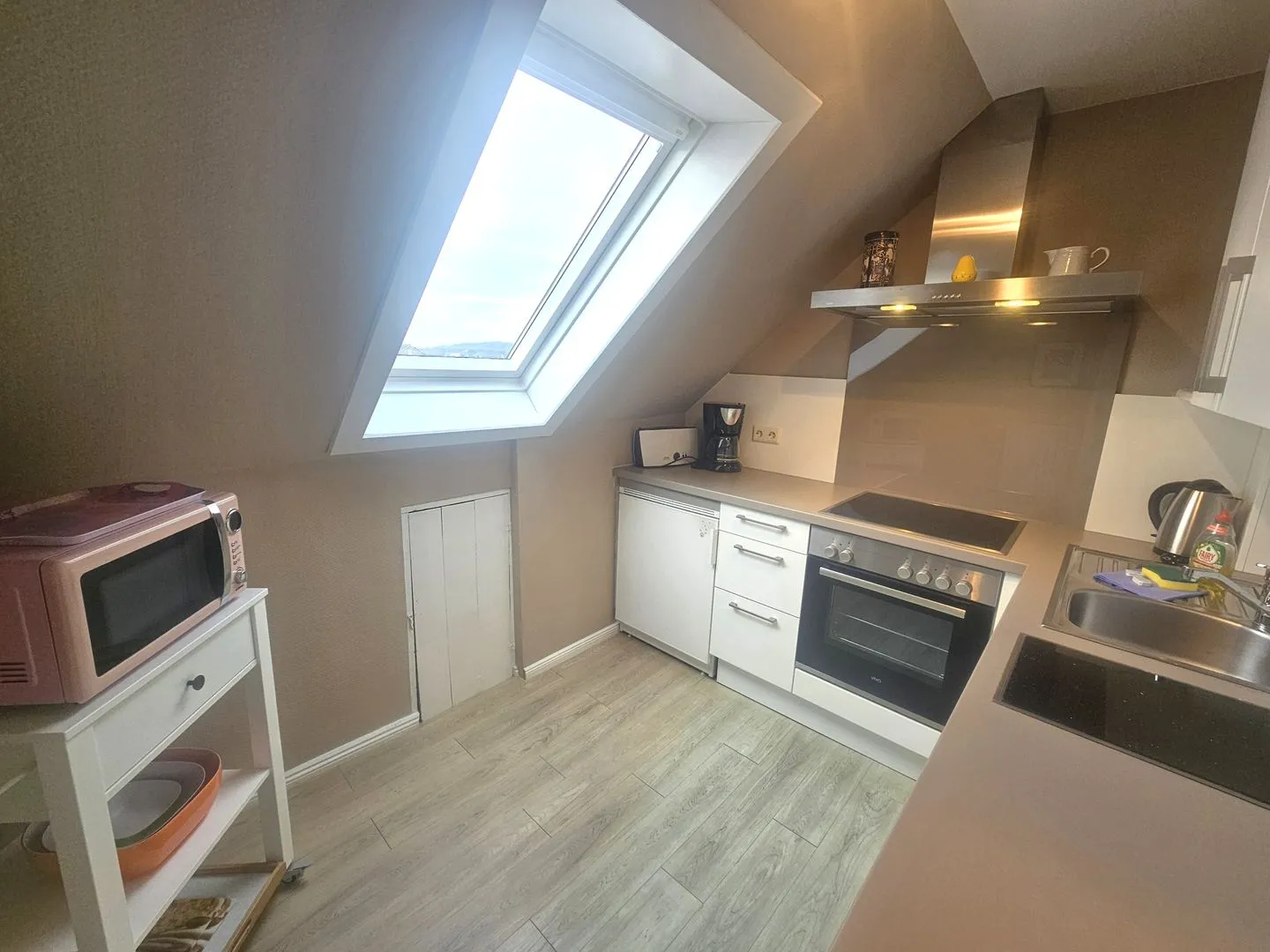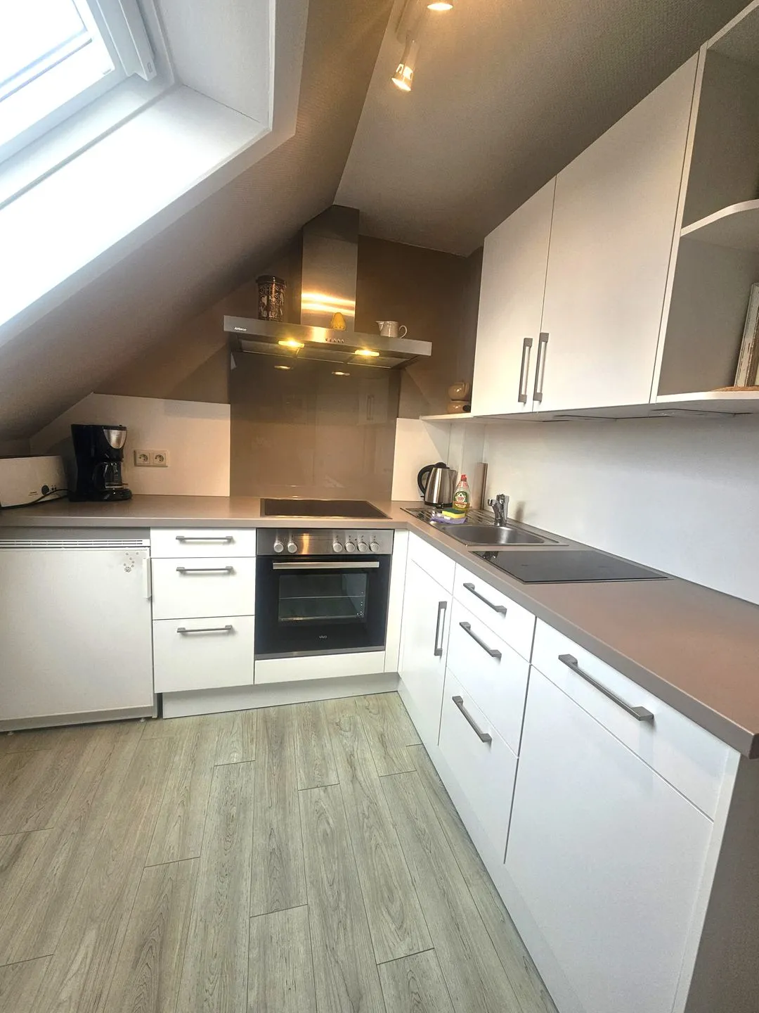 Die Küche ist vollständig ausgestattet und auf Selbstversorgung ausgerichtet: Herd mit 4-Platten-Kochfeld, Backofen, Mikrowelle, Kühlschrank mit Gefrierfach, Spülmaschine, Kaffeemaschine und Wasserkocher sowie Küchenutensilien, Geschirr und Besteck. Ein Essbereich mit Esstisch ist ebenfalls vorhanden.