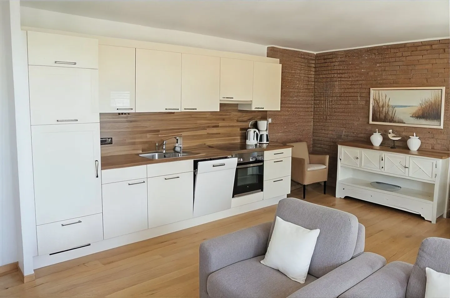 Der Wohnbereich ist einladend gestaltet und wird durch eine offen zum Wohnzimmer angelegte Küche ergänzt. Für Ihre Selbstversorgung steht Ihnen eine umfangreiche Küchenausstattung zur Verfügung: Herd mit 4-Platten-Kochfeld, Backofen, Mikrowelle, Kühlschrank mit Gefrierfach, Spülmaschine sowie Küchenutensilien, Geschirr und Besteck. Kaffeemaschine, Wasserkocher und Toaster sind ebenfalls vorhanden. Ein Esstisch mit Essbereich bietet einen passenden Rahmen für gemeinsame Mahlzeiten. Zur Unterhaltung stehen TV und Radio bereit, WLAN/Internet ist vorhanden.