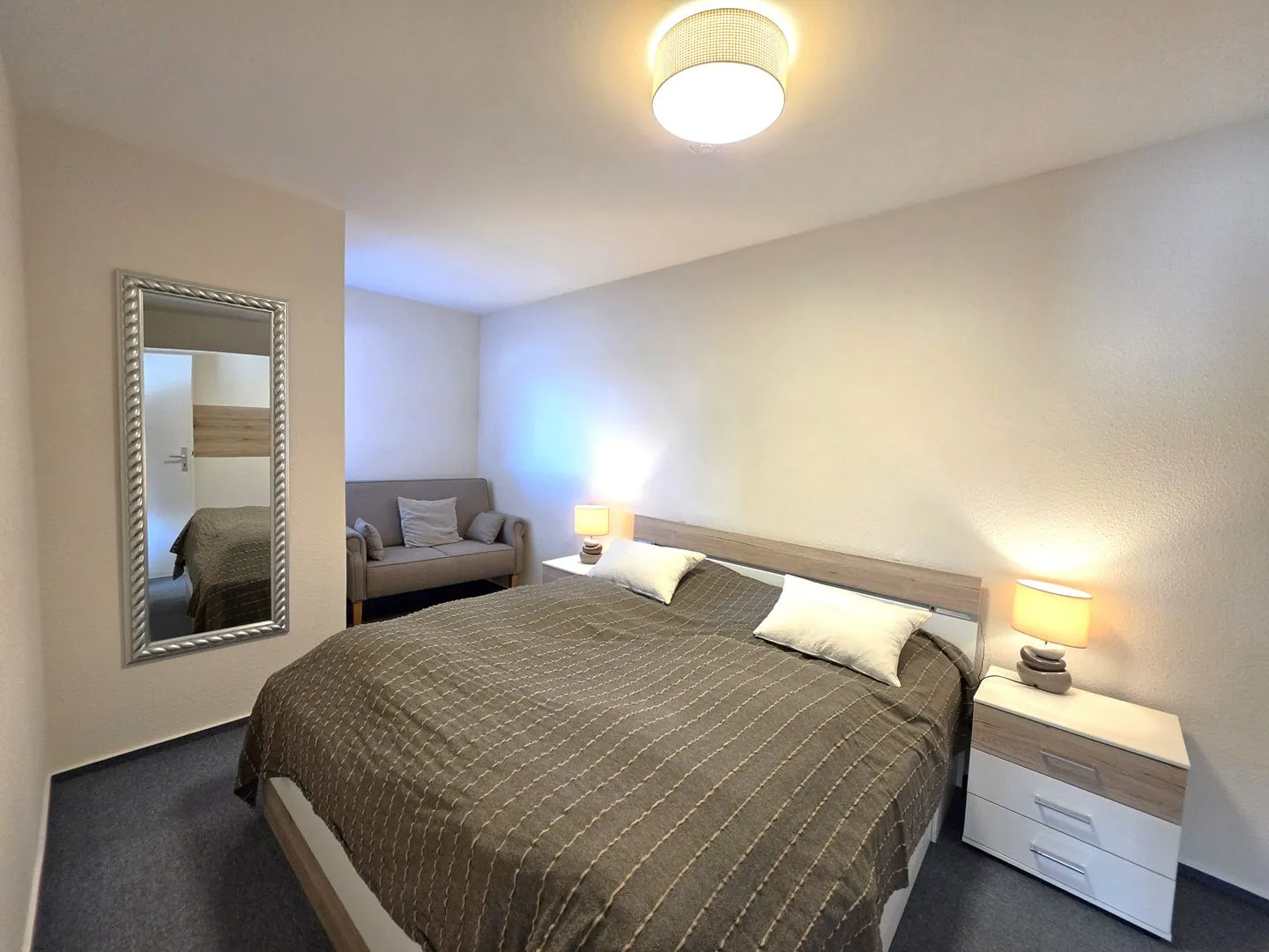 Die Unterkunft befindet sich im Tiefparterre und verfügt über insgesamt 2 Zimmer, darunter 1 Schlafzimmer, 1 Wohnzimmer, eine geschlossene Küche sowie 1 Badezimmer mit Dusche, WC, Waschbecken, Spiegel und Haartrockner. Damit eignet sich das Apartment gut für Paare, kleine Familien oder Gäste, die eine übersichtliche und gut nutzbare Raumaufteilung bevorzugen.