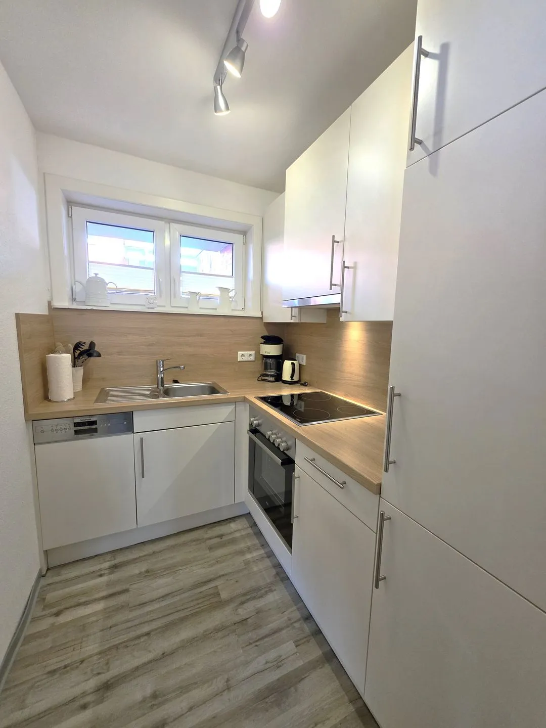 Die geschlossene Küche ist für die Selbstversorgung umfassend ausgestattet. Sie nutzen einen Ceranherd mit Backofen, Kühlschrank mit Gefrierfach, Spülmaschine, Kaffeemaschine, Wasserkocher und Toaster.