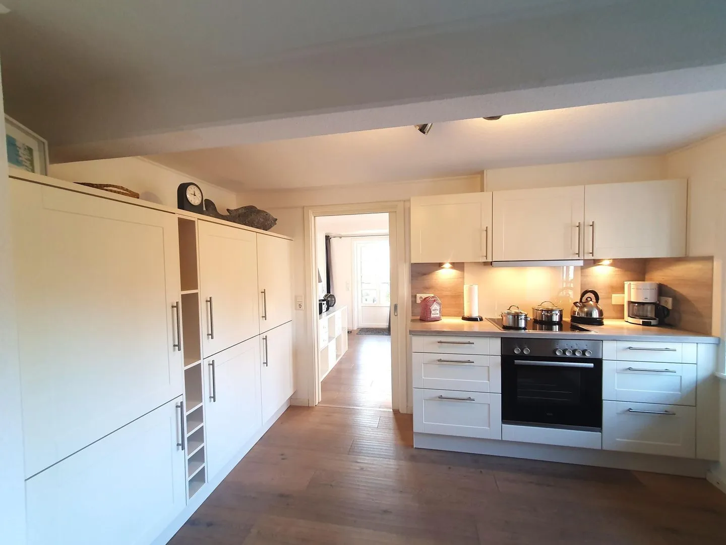Die geschlossene Küche ist umfassend ausgestattet und auf Selbstversorgung ausgelegt: Herd mit 4-Platten-Kochfeld, Backofen, Mikrowelle, Kühlschrank mit Gefrierfach, Spülmaschine sowie Kaffeemaschine, Wasserkocher und Toaster sind vorhanden. Geschirr, Besteck und Küchenutensilien stehen ebenso bereit wie ein Essbereich mit Esstisch für gemeinsame Mahlzeiten.