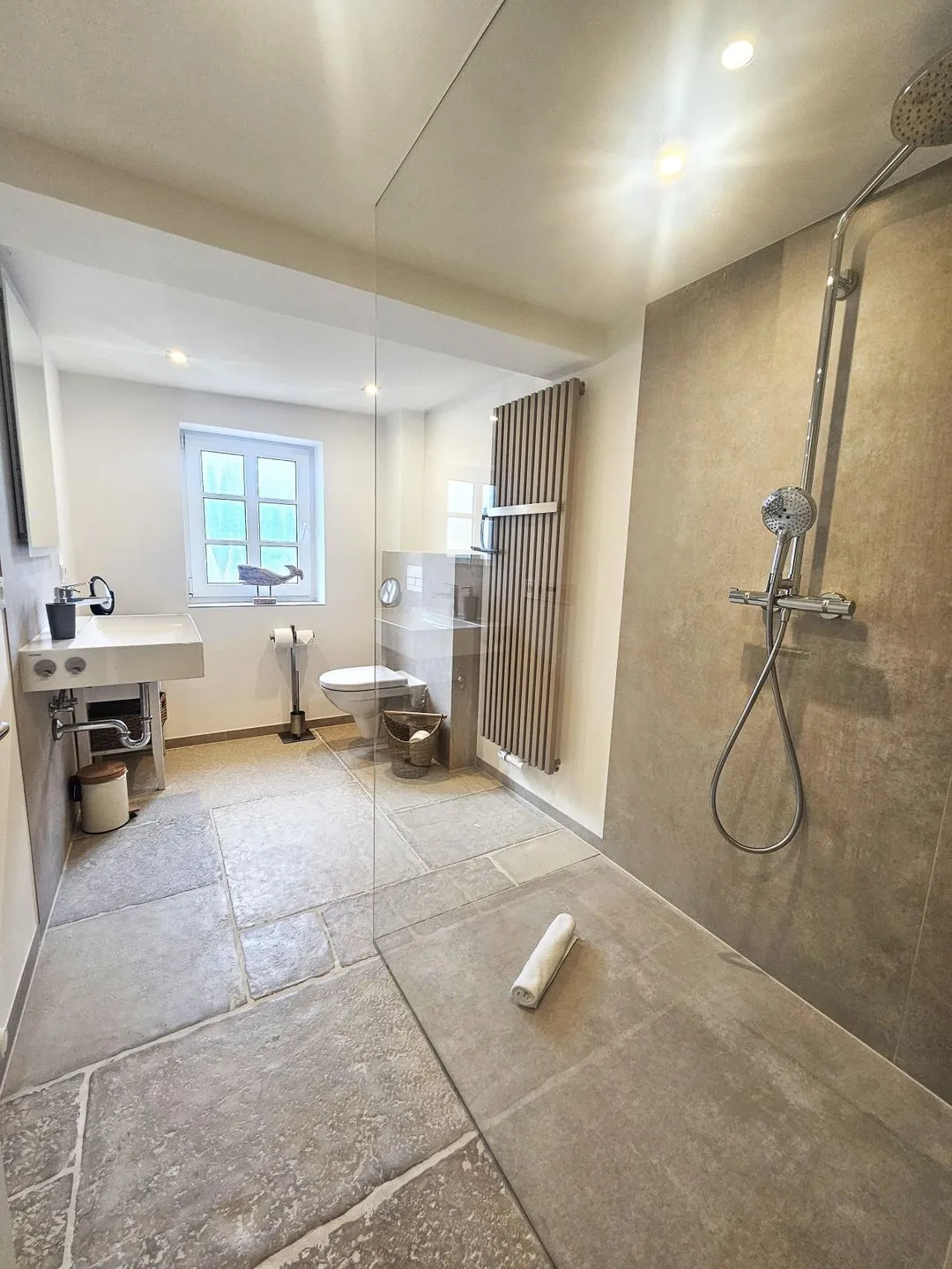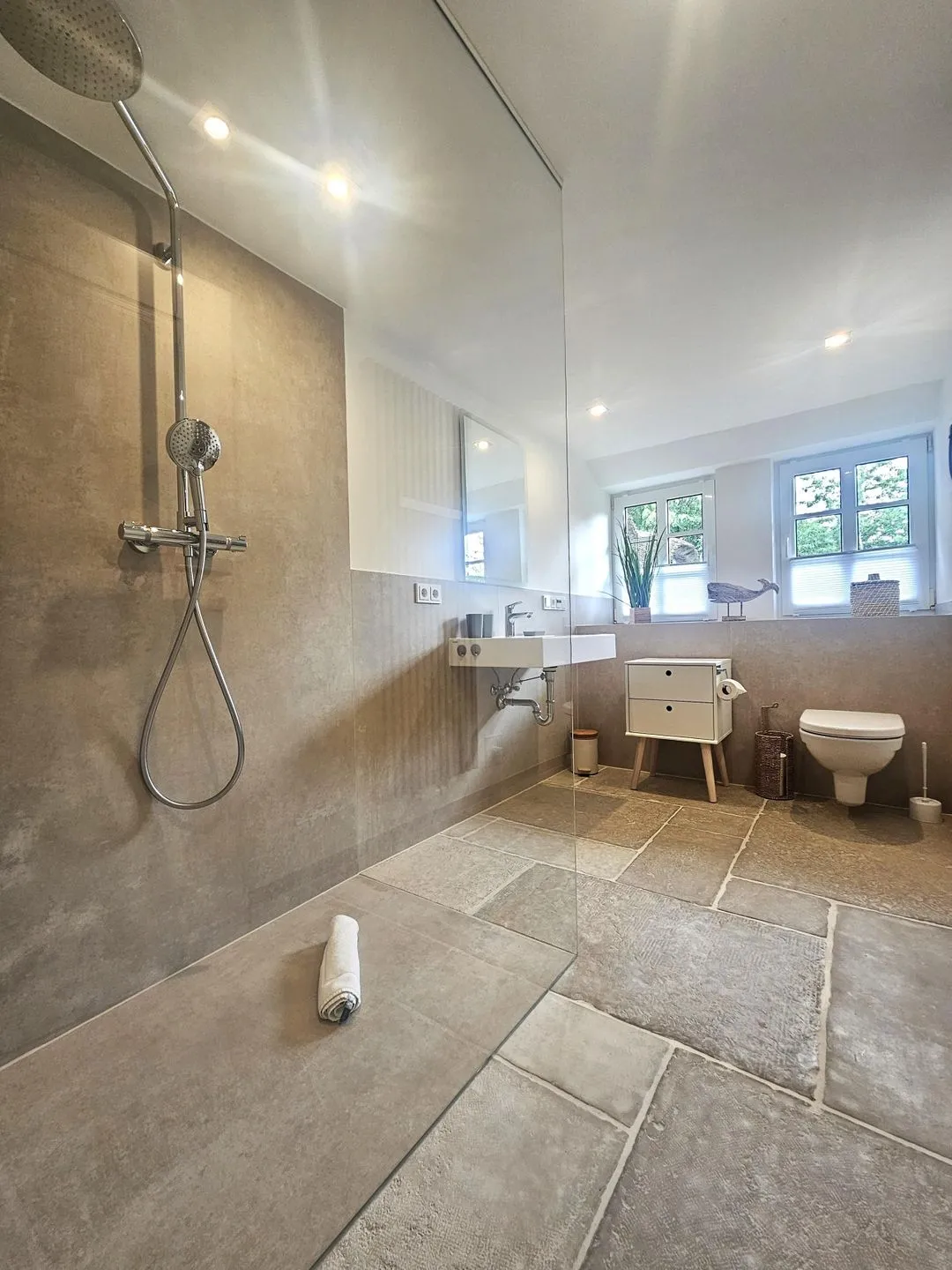Beide Badezimmer verfügen über bodengleiche Duschen; insgesamt sind 2 Duschen vorhanden. Warmes Wasser und Heizung sorgen ganzjährig für Komfort. Für längere Aufenthalte oder mehr Flexibilität stehen Waschmaschine und Trockner zur Eigennutzung bereit; Bügeleisen und Bügelbrett ergänzen die Ausstattung.