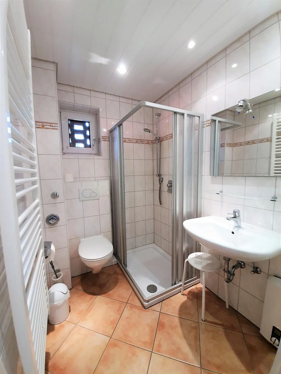 Die Wohnung verfügt über 1 Schlafzimmer mit kleinem Doppelbett (140x190) und 1 Badezimmer mit Dusche, WC und Waschbecken. Für längere Aufenthalte oder sportliche Tage ist die gemeinschaftliche Nutzung von Waschmaschine und Trockner möglich (gegen Gebühr); Wäscheständer und Staubsauger stehen ebenfalls bereit. Die Wohnung ist als allergikergeeignet ausgewiesen.